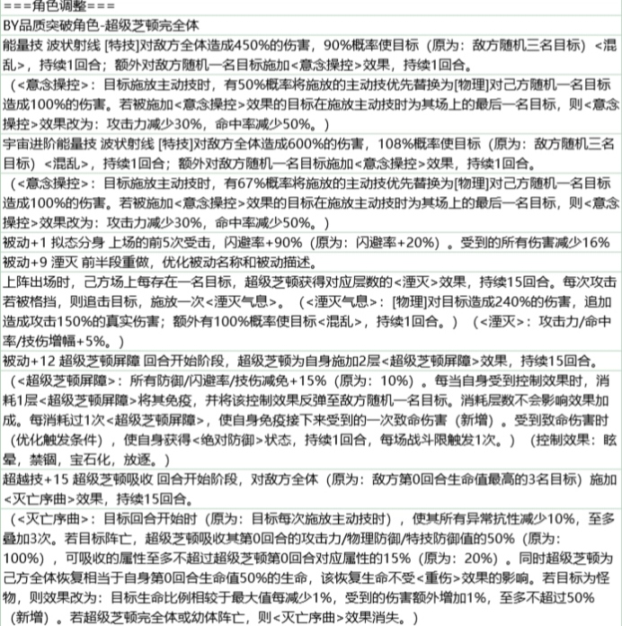 解析:这个超越技能增强的就是改为了回合开始对敌方全体施加一个这个专属buff,而不是原来的对地方最地灵回合的生命之三命目标这样的话就可以做到全体受到这个buff的影响,后面这个炮灰全部清除的情况下,可以超大幅的提高自身的双防和攻击力。之前是可以获得1%,100现在改为可以,对面炮灰全部清除的情况下就可以叠加50%,这样如果对面5名角色都全部阵亡的话,可以获得250%的这些数值。同时这个角色会为乙方全体恢复,相当于地灵魂和生命值的50%生命这个而且不会被中伤效果影响,如果目标为怪物的效果改为目标生命比相较于最大值,每减少1%就会增加受到的伤害最多不超过50%这一条的增幅是新增的,让这个角色获得了更高的强度