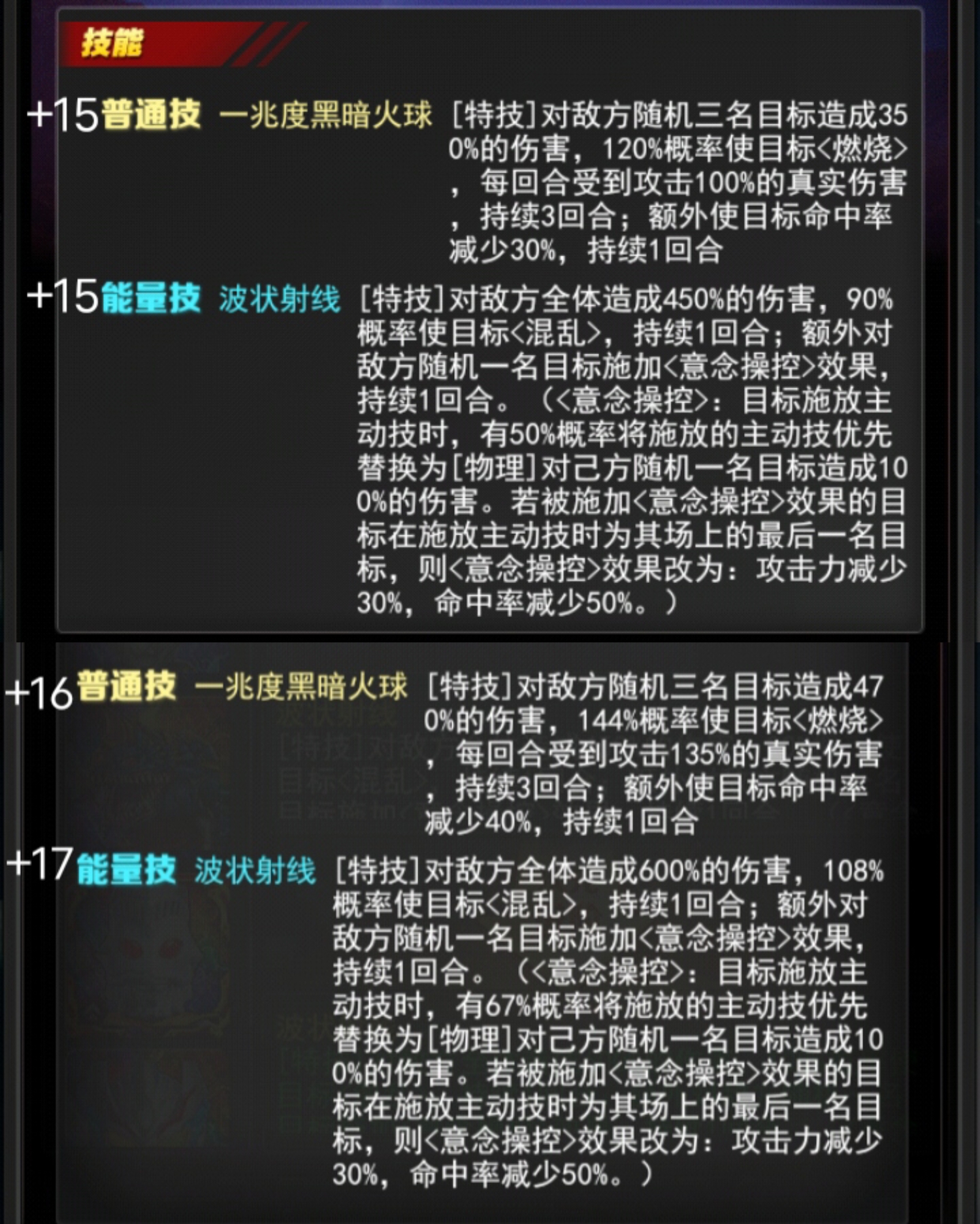 +17能量技波状射线 [特技]对敌方全体造成600%的伤害,108%概率使目标<混乱>,持续1回合;额外对