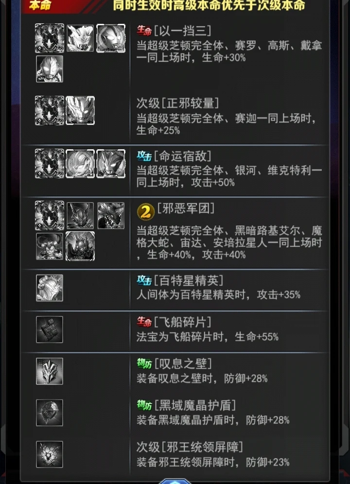 解析:每存在一名怪兽角色释放能量计,自身的免伤率就增加20%持续一回合,这个是怪兽带来的增益,额外解除为自身解除一层异常效果,异常效果就是混乱眩晕这些效果属于异常效果。有一名奥特曼角色释放能量计增加自身双防5%,持续一回合,增加一点能量,这个就看自己怎么怎么搭配了,我的建议是搭配纯邪。收益比较高一点。这个角色这个被动,不管打什么阵容都比较好,打奥特曼有增加双防的能力,打怪兽有提高自身免伤。而且还会解除异常,异常效果