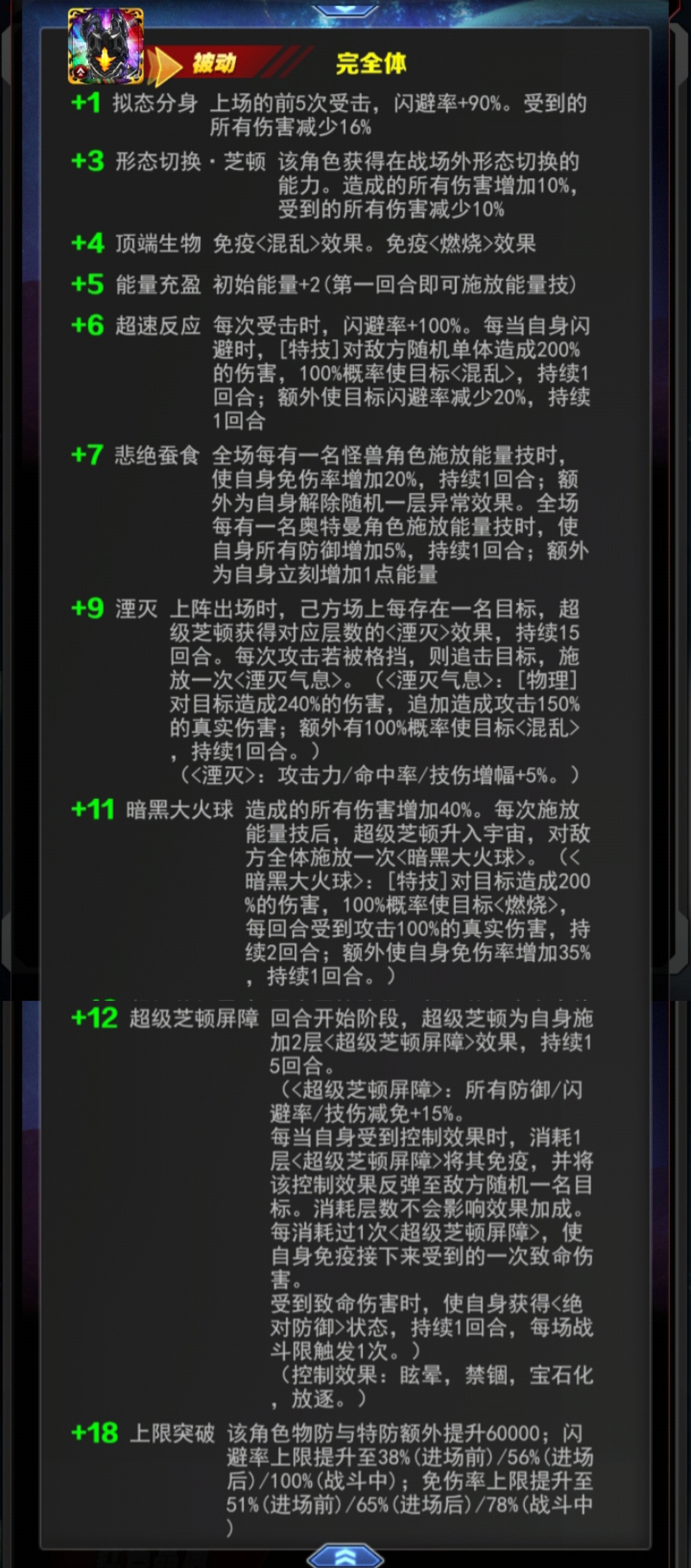 +7 悲绝蚕食全场每有一名怪兽角色施放能量技时,使自身免伤率增加20%,持续1回合;额