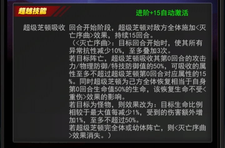 超级芝顿吸收回合开始阶段,超级芝顿对敌方全体施加<灭亡序曲>效果,持续15回合。