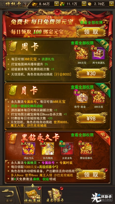 新手推荐开通月卡或永久卡,除了大量稀有资源礼包、炫酷时装免费赠送外,还可解锁各类BOSS、副本自动挑战功能,绝对不错过任何一个BOSS,成为最强野战达人!