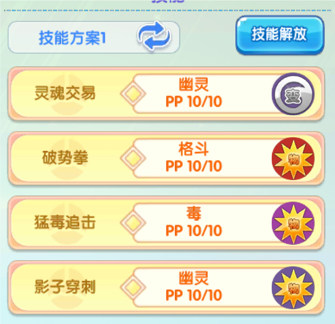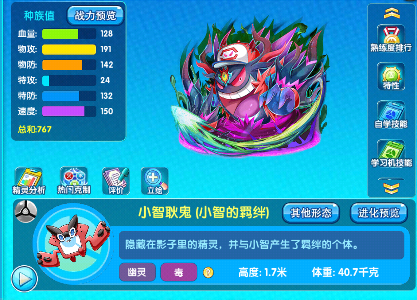 这个形态的耿鬼是继承了耿鬼这个宠物固定的能力,也就是攻击力高,速度快,但是皮脆的特点,同时抛弃了耿鬼固定的特攻输出路线,改为了用物攻输出,属性方面的话,还是没有改,还是原来的幽灵和毒属性。说实话,这种属性搭配在当前环境下弱点非常多,而且大部分都是主流弱点。