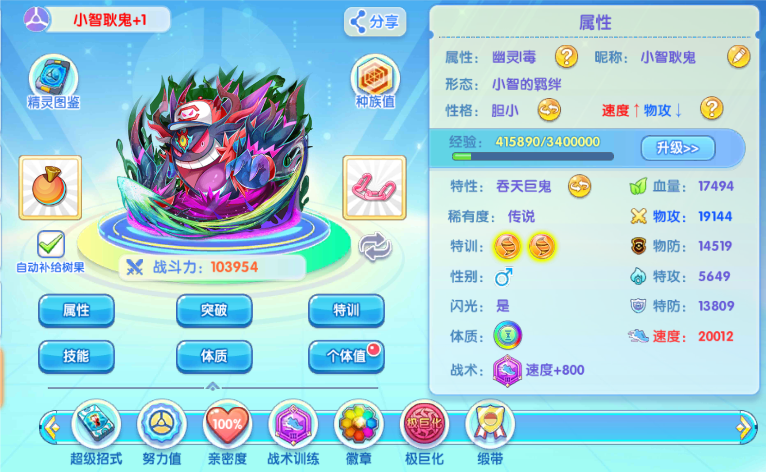 性格:开朗,努力值:物攻速度,道具:各类增伤道具,特性:吞天巨鬼,极巨化