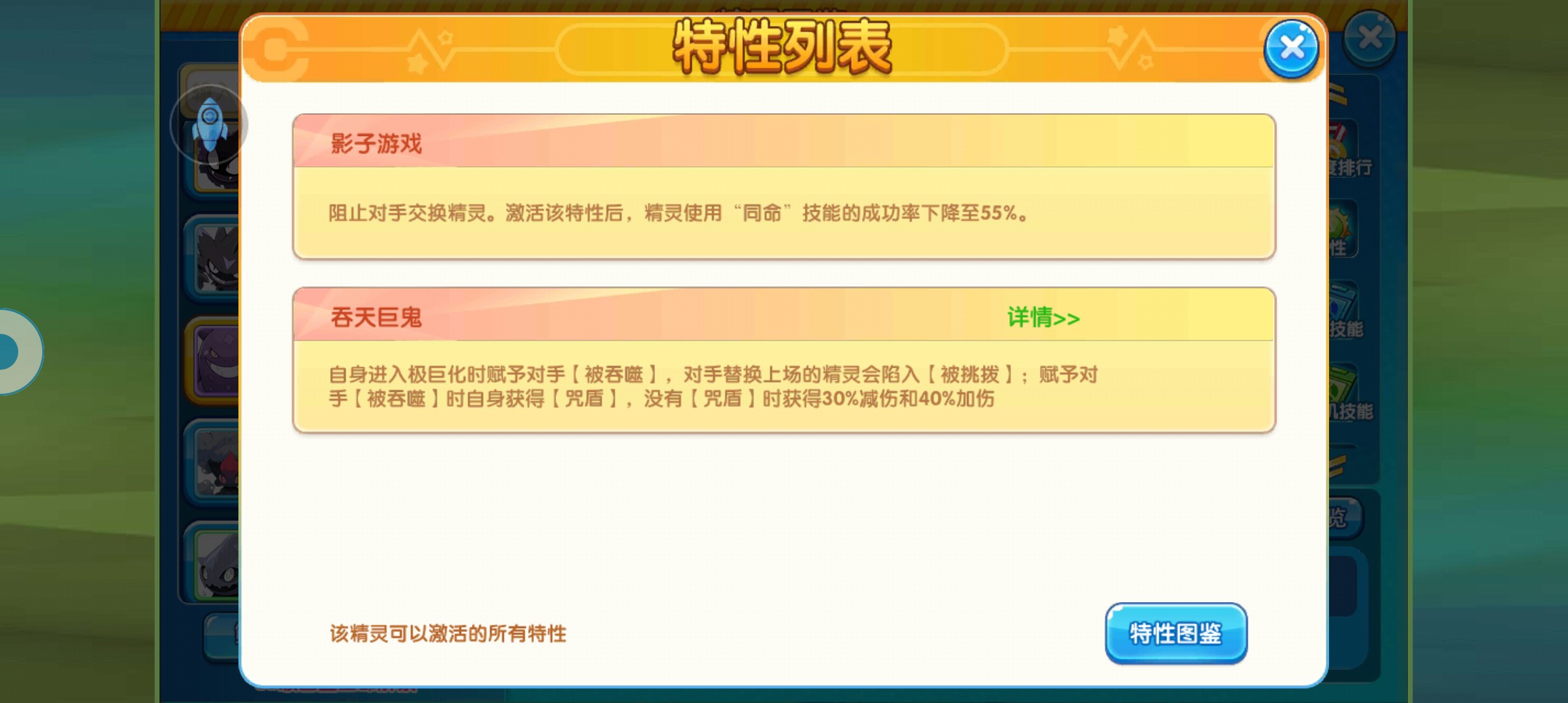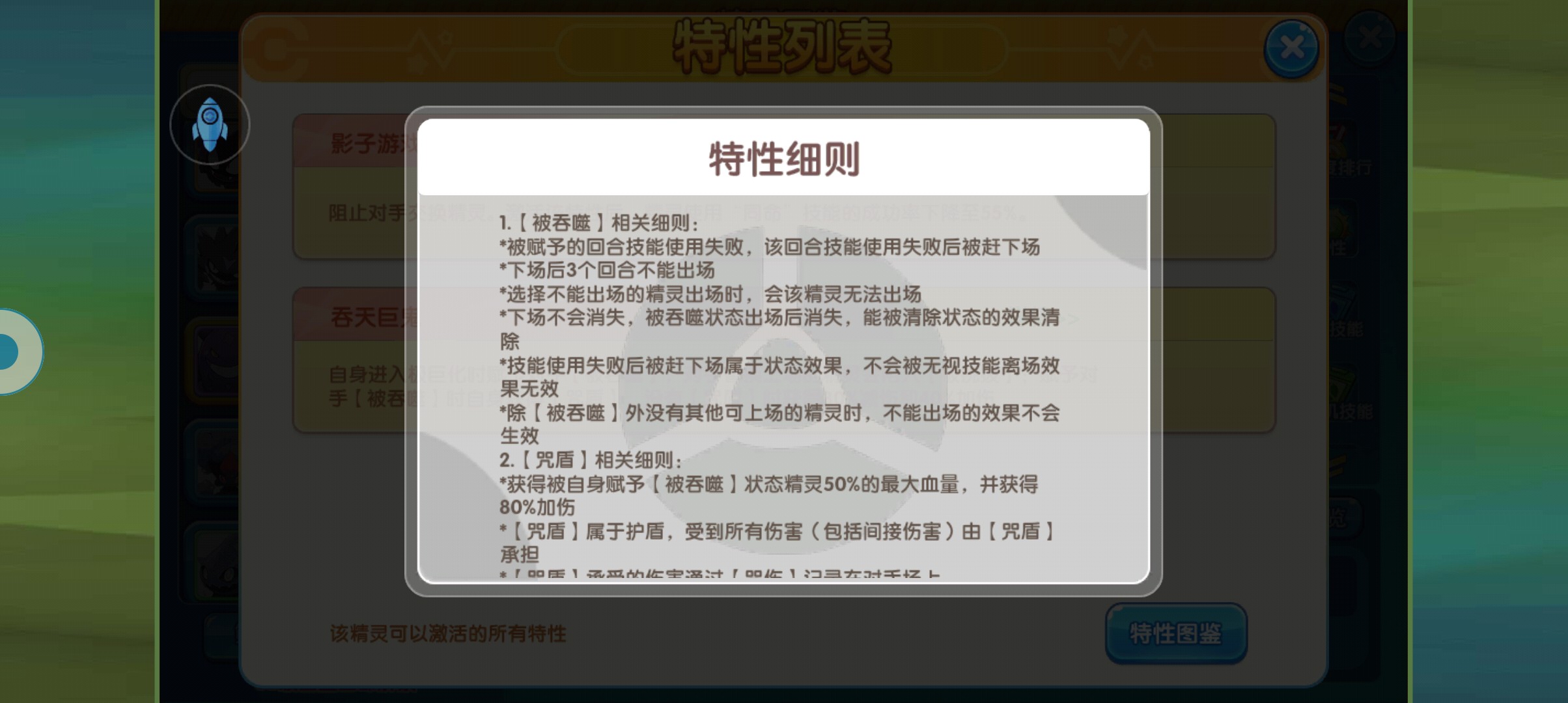 那么后面一句话就是让对方替换上场的队友陷入到被挑拨状态,这个效果只能说还不如让对方的精灵陷入到回复阻挡状态好一点,毕竟对方甩上来的精灵是不确定性的,万一对方被你甩上来的是另外一个核心的输出,那就尴尬了搞不好还得要浪费一个耿鬼的队友去吃这个假设的核心精灵伤害,然后这个特性,最后一段话非常的简单,就是吸收对方精灵最大生命的50%给自身增加咒盾