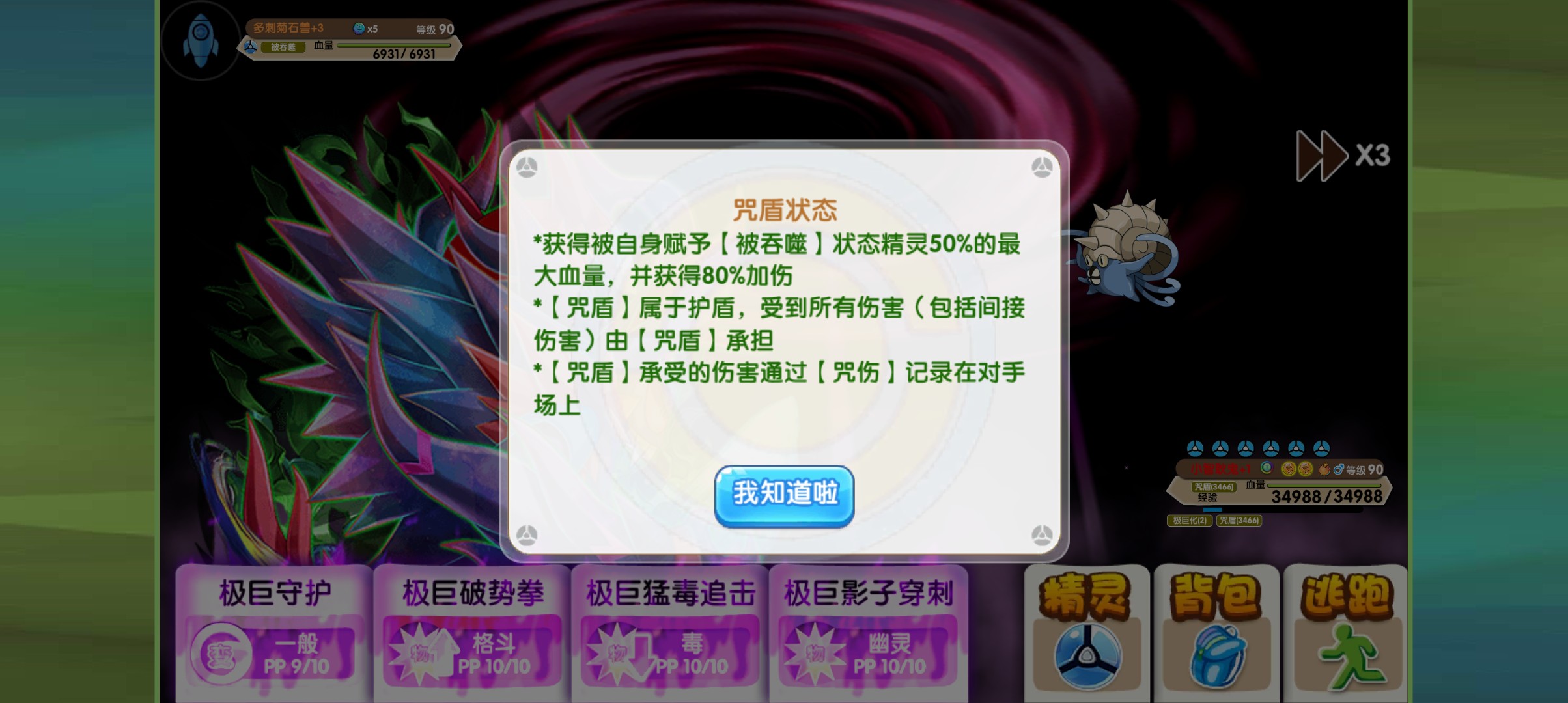 这里要先来介绍一下影子穿刺这个新的技能,这个技能的效果是攻击对方,让对方进入到三回合黑色目光状态,然后攻击处在黑色目光状态下的精灵,还可以额外增伤,搭配自身的盾带来的80%的加伤,说实话的伤害还是蛮可观的,只是速度和防御跟不上,不过利用这个技能抓一些辅助还是可以的,当然了,利用技能抓人远比不了,用特性抓人就好像奈克洛兹玛的特性,骗术空间永远比技能骗术空间要好的太多太多了,因为使用技能给对方增加各种状态了的话会让对方有反制的条件,而且会浪费一个回合,有点挺尴尬的,而且更关键的是这个影子穿刺技能是一个幽灵属性的招式,遇到一些抵抗和免疫的那就尴尬了。