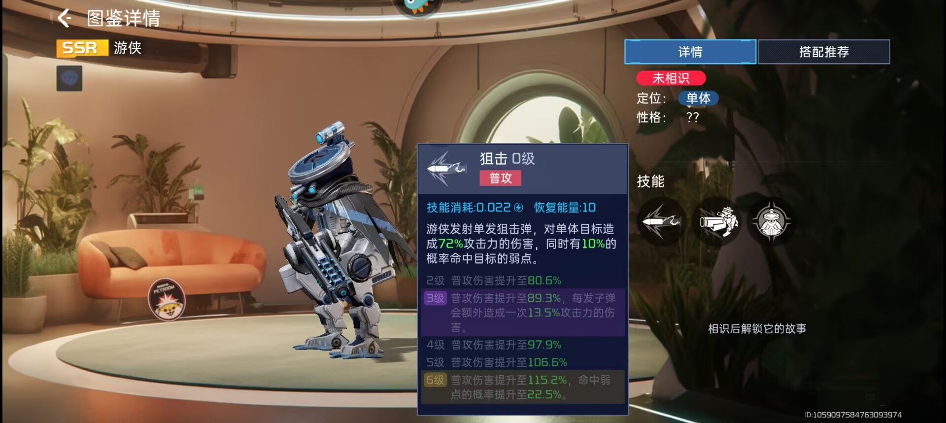 游侠普攻为:【狙击】。对敌人发射狙击伤害,同时降低有几率命中敌人的弱点,满级技能命中弱点慨率是22.5%。这个几率也算是比较鸡勒的了。