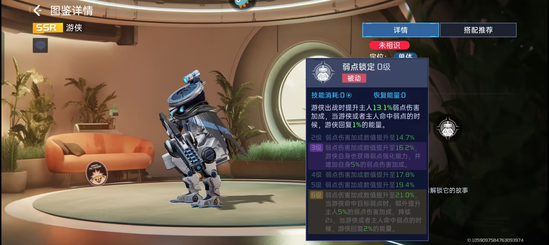 可以提升主人13.1%的弱点伤害加成。满级可以提升21%的弱点加成和额外提升主人5%弱点伤害加成。并且游侠和主人每次命中敌人弱点同时也可以回复游侠的能量。