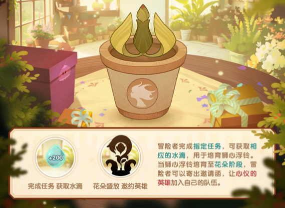 5.“期愿邀约”活动将于当地时间:05/01/2024 08:00开启.活动期间.冒险者完成指定任务,可获取相应的水滴,用于培育狮心浮铃。当心浮铃培育至花芽阶段和花莆阶段,冒险者可以获取相应的奖励。培育达成所有进度后,冒险者可以寄出邀请函,让心仪的英雄加入自己的队伍。