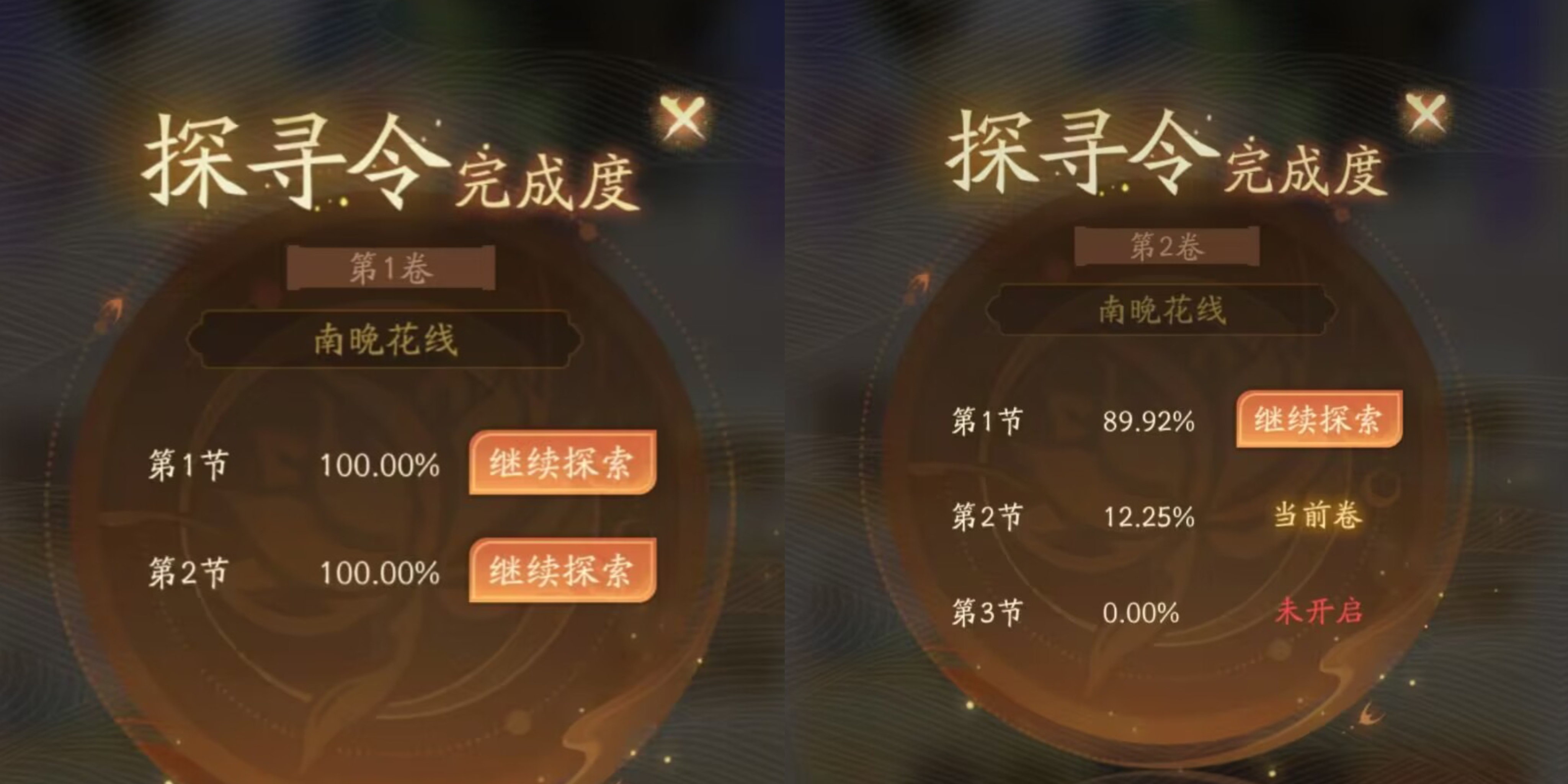 ①主线关卡:第一卷第1节和第2节南晚花章节:全100%通关。