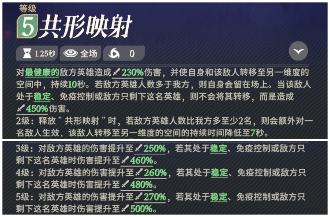 1技能,虚空放逐,会把自己和敌人同时放逐到虚空中,但是当敌方人数比己方人数多或者自己处于免控状态的时候,技能不对自己生效,当敌方处于免疫控制状态或敌方仅剩余一人时,只对敌人造成伤害效果。