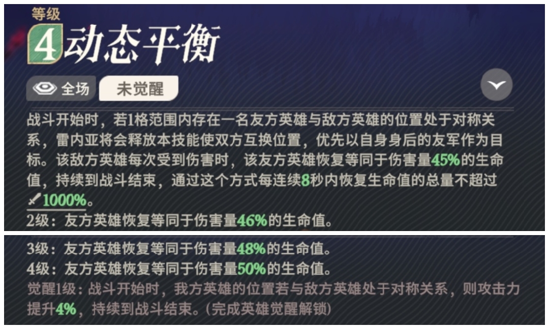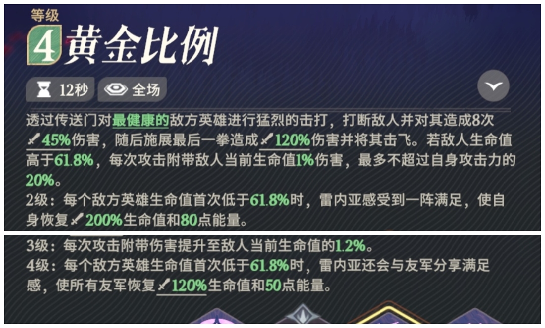 3技能,被动效果,敌方每个英雄血量首次低于61.8%时,都会使我方全体回血回能。