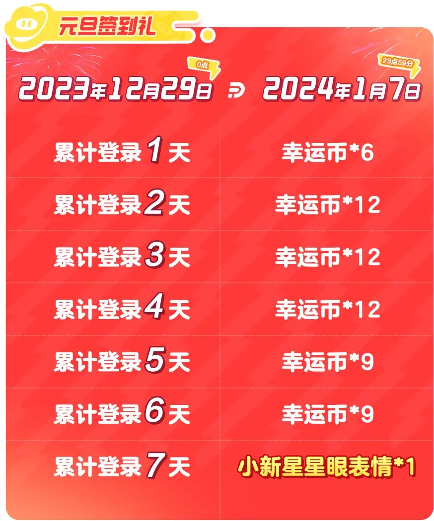 2023年12月29日-2024年1月7日24点星宝们累计登录7天,不仅可以拿60幸运币,还可免费领取小新表情——星星眼这么多关于小新的免费福利都要把星妹砸晕咯~星妹直接秒变迷妹星星眼(✪ω✪)
