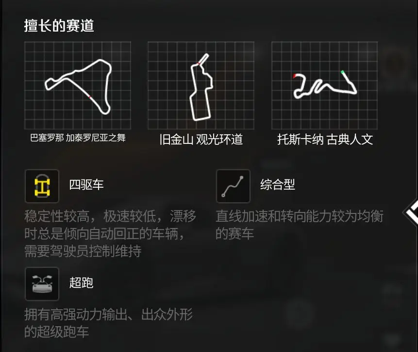 保时捷918 Spyder '15是一台直线加速十分出众的超级跑车,小极推荐大家到巴塞罗那-加泰罗尼亚之舞、旧金山-观光环道、托斯卡纳-古典人文等赛道尽情加速飞驰。