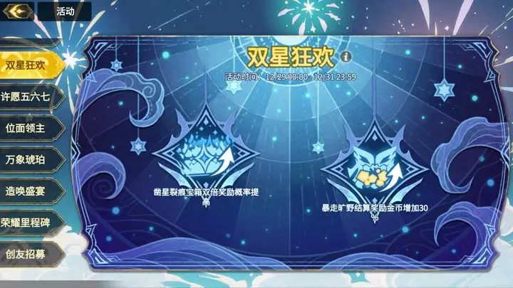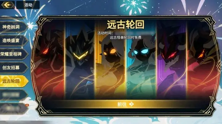 超进化铃铃铃:活动已开启光环资讯 - 卡牌发布于 2023-12-29关注「远古轮回」活动现已开启!活动期间,探索者可以免费更换远古族怪兽!想试试新阵容的探索者可别错过啦!⭐活动时间:2023年12月29日-2023年1月4日23:59除此之外,周末专属活动「许愿五六七」、「双星狂欢」也已开启!参与「许愿五六七」有机会获得“形态末梢”在许愿商店中兑换形态喔~「双星狂欢」活动期间,每日开启两项增益,探索效率立刻拉满!