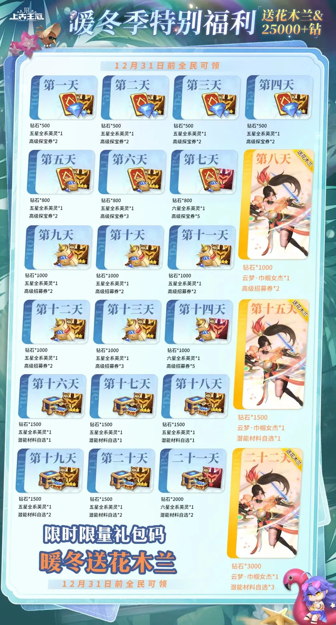 ● 每日将解锁超值礼包可购买;若购买全部礼包,还可额外从豪华奖励中自选:魂刻秘宝碎片自选(更新至魂刻·瑞兽彩灯&魂刻·镇煞风灯)、双旦英雄随机陨火神兵(随机获得盛世主题英雄至忘川鬼君专属神兵的其中之一)、圣痕刀刻、启迪天赋果、传奇魔典碎片箱。