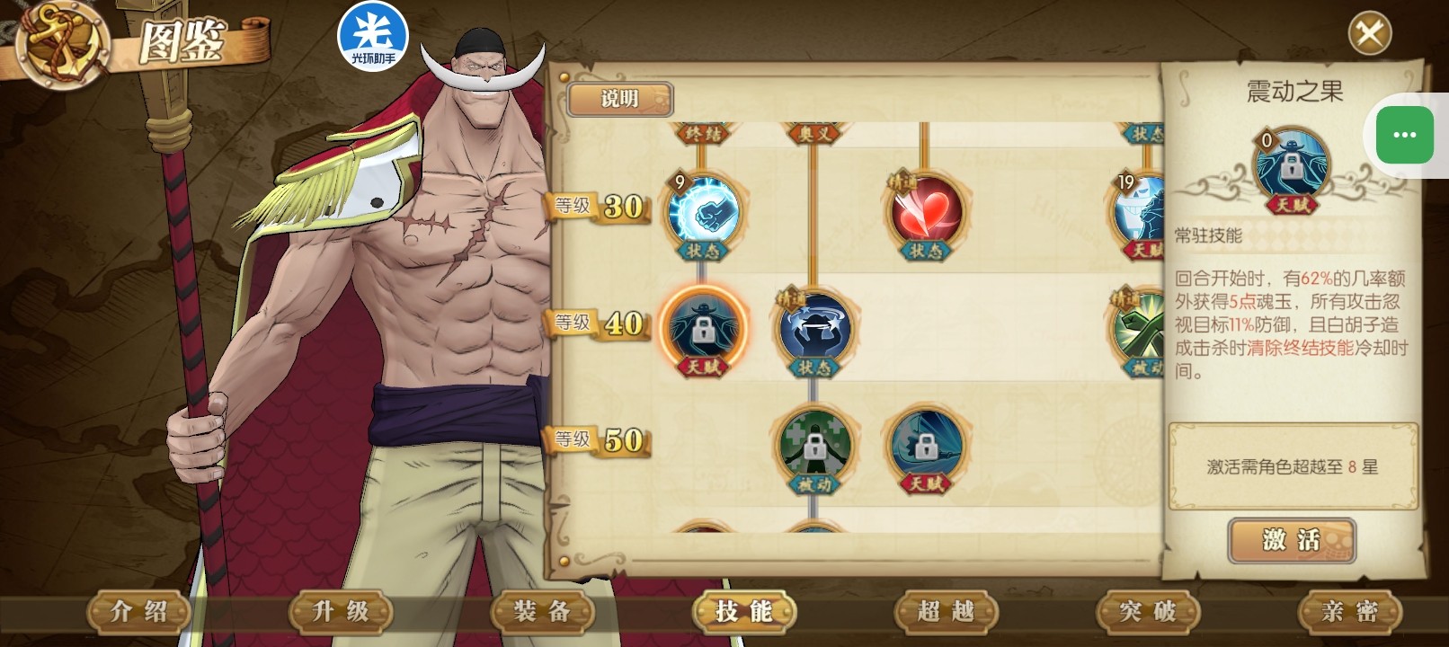 ①:白胡子:白胡子能肉当前排并输出高,奥义带眩晕或打乱站位,抬手概率为50%,一回合只能触发2次。十分看脸,但白胡子击杀副本人物,终结技CD清零,能无限终结技。对于平民玩家来说,白胡子先考虑6星,6星够有各种副本场景使用。金魂留给下一位更强的限定。