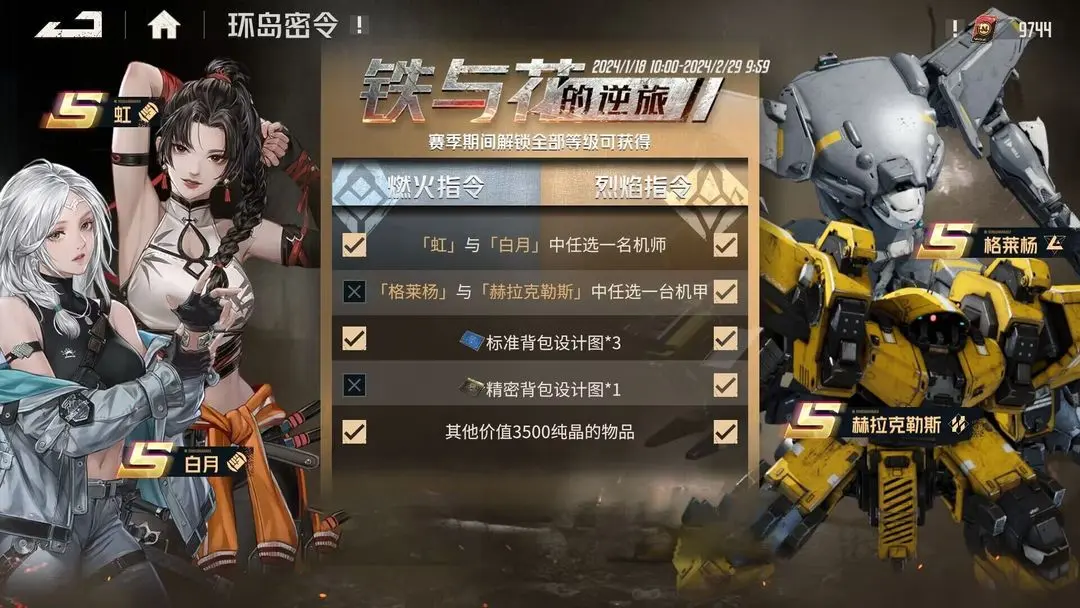 激活“燃火指令”,除常规密令奖励外,还可领取S级标准背包设计图*3、格斗精英机师调用凭证(打开后可在【虹】与【白月】中任选一名机师)及其他价值3500纯晶的物品;激活“烈焰指令”,除“燃火指令”包含的内容外,还可额外获得随机S级背包、格斗精英机兵自选箱(打开后可在【格莱杨】与【赫拉克勒斯】中任选一台机甲)等丰厚奖励。