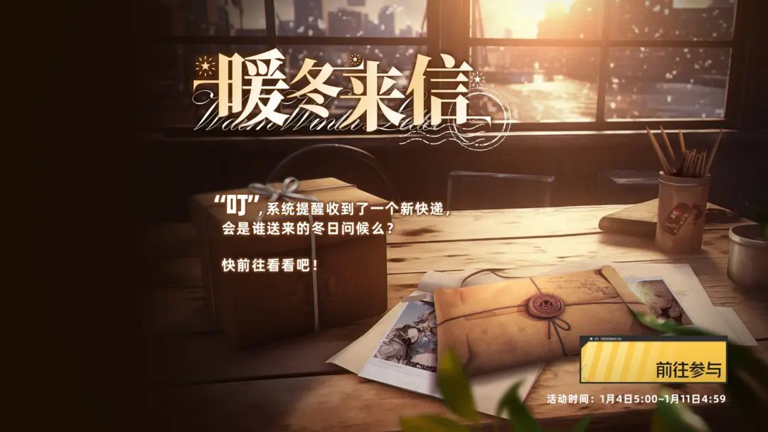 1.福利活动“暖冬来信”将在1月4日维护后-1月11日4:59开启;活动期间,指挥官每日可领取来自机师的信件并领取奖励;