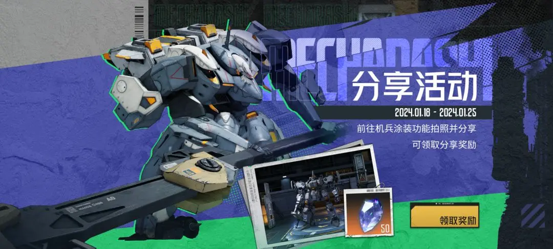 4.“涂装分享”活动将在1月18日5:00-1月25日4:59再次开启;活动期间,指挥官前往机兵涂装功能拍照并分享可领取分享奖励:纯晶*50。