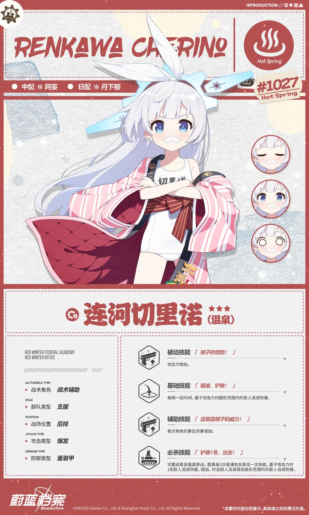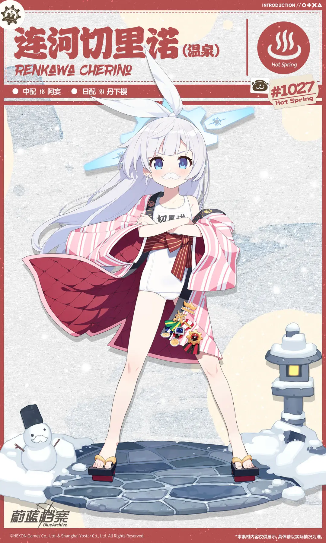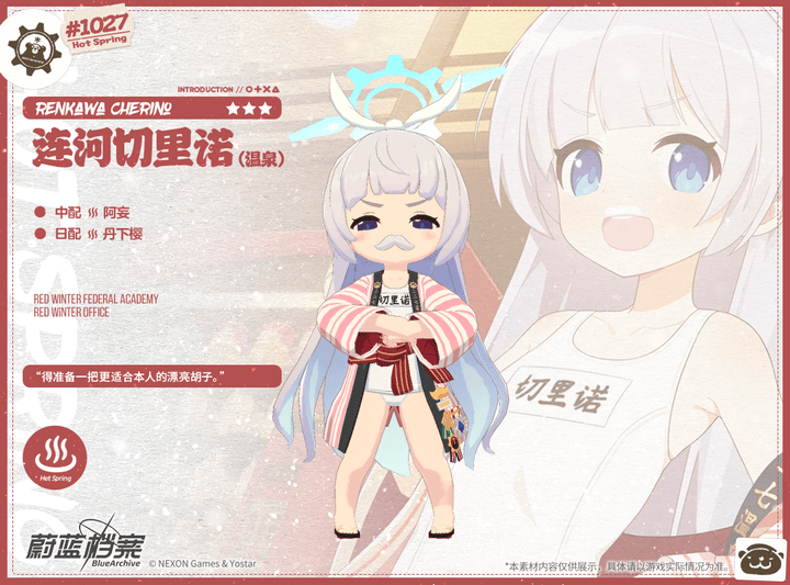 【新增人物档案】连河切里诺(温泉)光环资讯 - 二次元发布于 2023-12-30关注 //////////档案启封//////////■连河切里诺(温泉)来227号温泉乡度假的红冬会长。最初对特别班擅自建造的温泉浴场感到十分不满,但在体验了和香以及特别班成员们的招待后,决定留在温泉浴场休息。对温泉浴场的休息设施和食物非常满意,反而对温泉浴本身没什么兴趣。“不管多冷的地方都没问题!因为本人是红冬学院的伟大秘书长!”