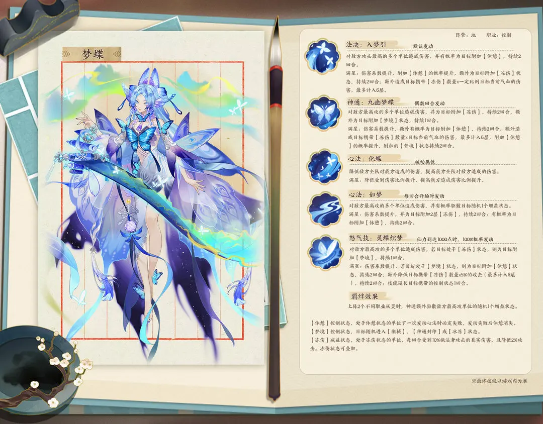 ●神通·九幽梦蝶:对敌方最高攻的3个单位造成290%伤害,并为目标附加【冻伤】,持续2回合,额外为目标附加【梦境】状态,持续1回合。