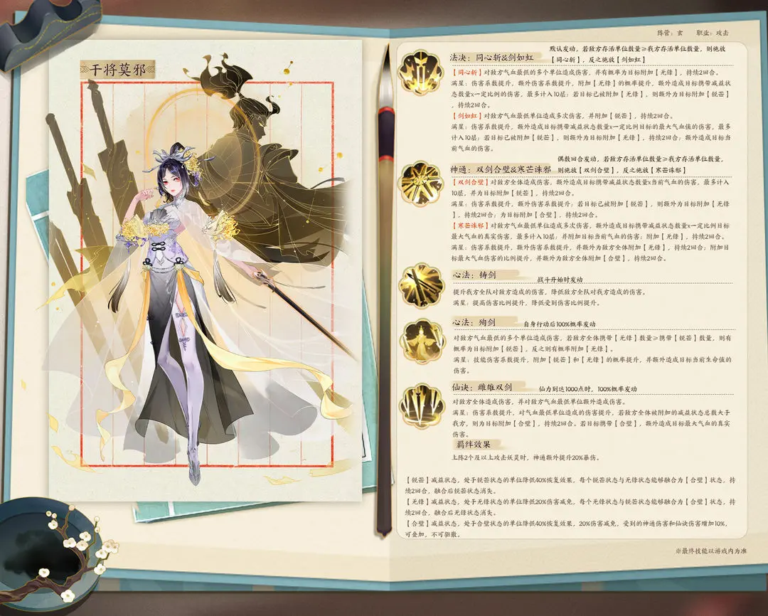 ●神通·双剑合璧:对敌方全体造成450%伤害,额外造成目标携带减益状态数量x3%当前气血的伤害,最多计入10层,并为目标附加【锐芒】,持续2回合。