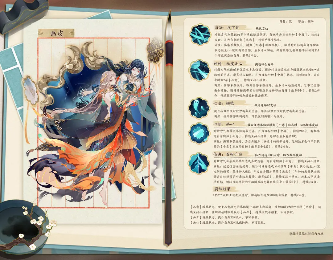 ●神通·画皮无心:对敌方气血最低单位造成2次340%伤害,额外对目标造成自身增益状态数量x40%的伤害,最多计入10层,并为目标附加【中毒】状态,持续2回合,为自身附加2层【画意】,持续至战斗结束。