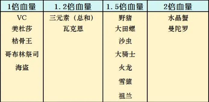 1.0倍血量:VC,美杜莎,枯骨王,哥布林祭司,海盗
