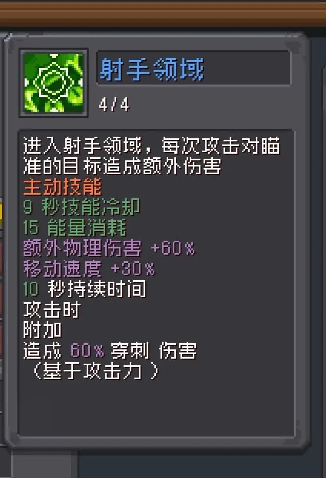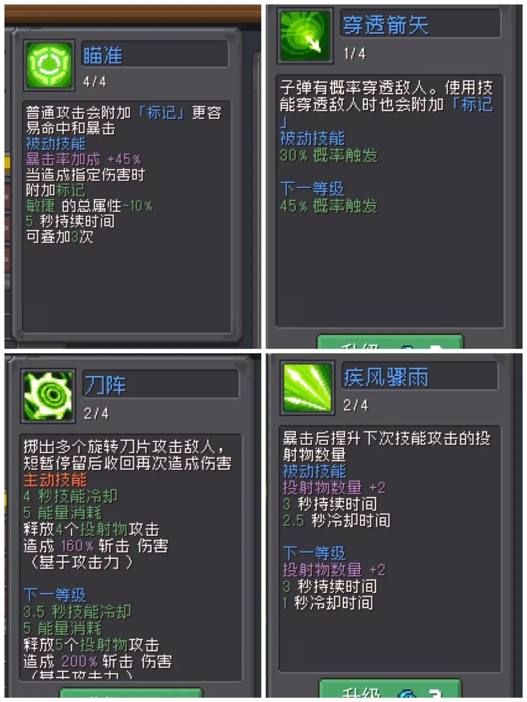 着重说一下副主动为什么是刀阵,因为精准弹幕没啥伤害,清白图经常打不到怪,更清不了箱子。其次分裂箭太短,穿云箭便秘。刀阵也是矬子里拔高个了,勉强用用吧,一次技能能挂多层瞄准,不过还是短了些。