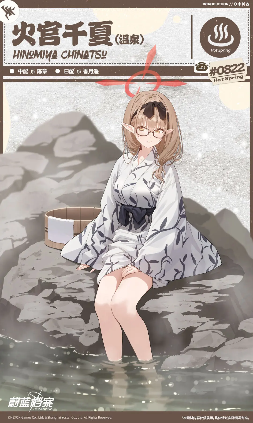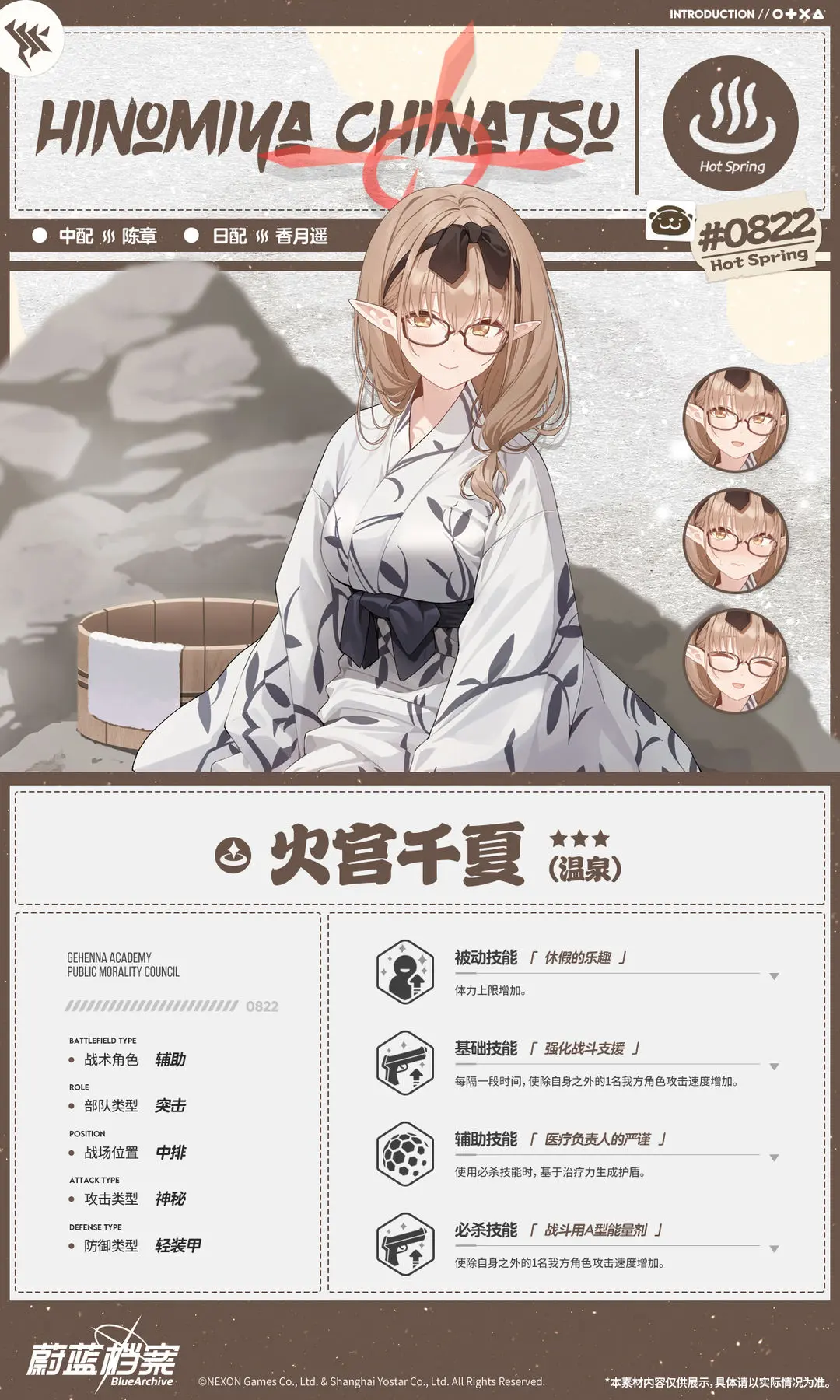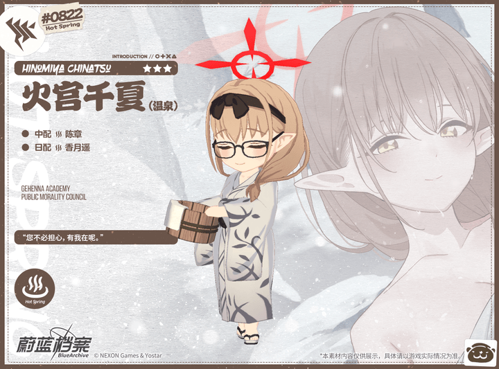 【新增人物档案】火宫千夏(温泉)光环资讯 - 二次元发布于 2023-12-31关注 //////////档案启封//////////■火宫千夏(温泉)歌赫娜风纪委员会的医疗负责人,在工作途中因机缘巧合来到了温泉浴场。从订购新的药品,到阻止温泉开发部的新阴谋……即便来到了雪国的温泉浴场,她也不得不面对困扰她的诸多问题。不过,温泉乡的美景和悠闲氛围确实让疲惫紧绷的她稍显放松。“今天就先忘掉工作,和我一起好好休息怎么样?”