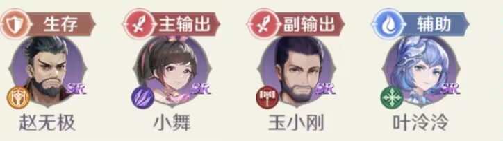 这套阵容是以小舞和玉小刚为核心输出,玉小刚可以提升团队的攻击力并且造成重伤效果,能够非常好的配合小舞的重伤提升爆发能力。