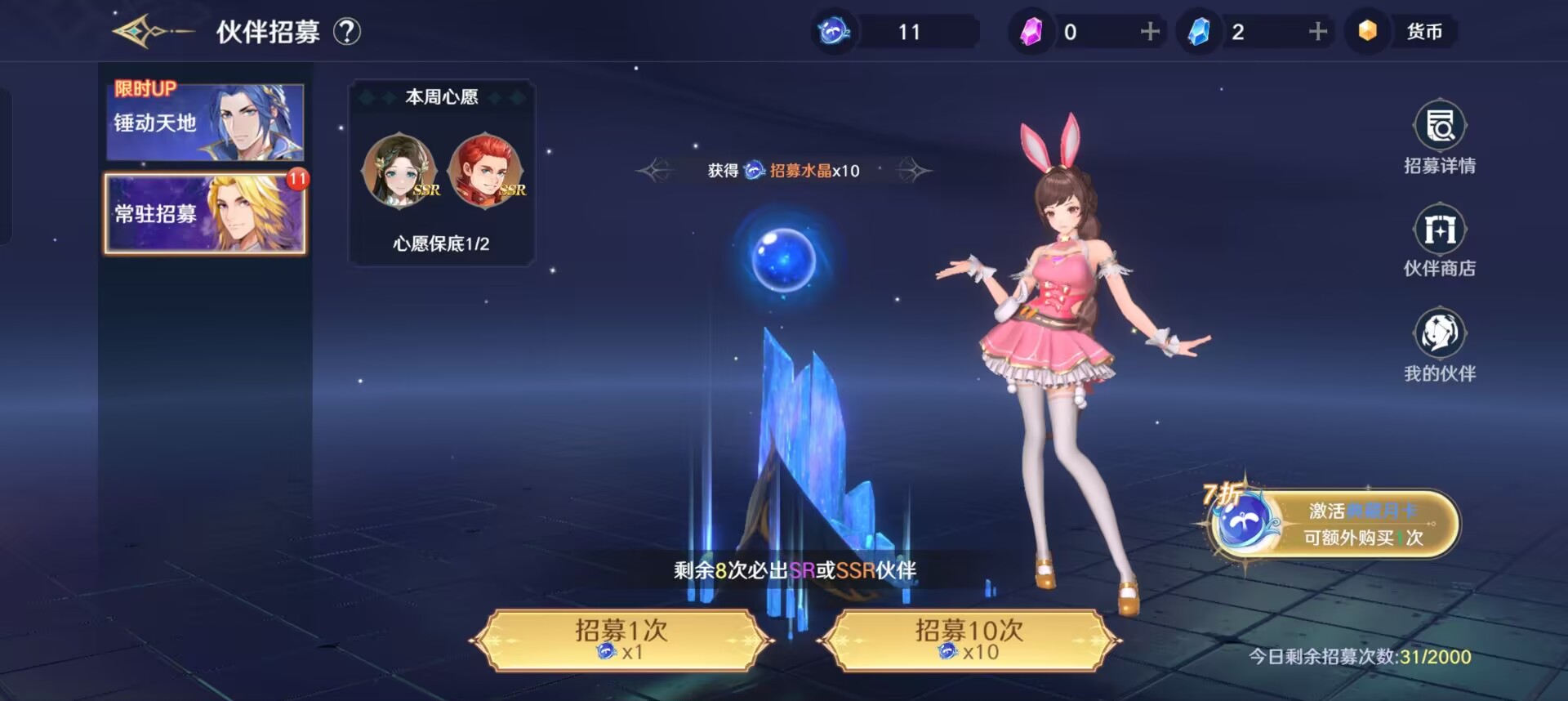 马红俊首充25元可以送,或者是累计抽卡180抽可以送,宁荣荣完成新手目标7天就可以获得。前期没有宁荣荣就用叶冷冷代替就可以。