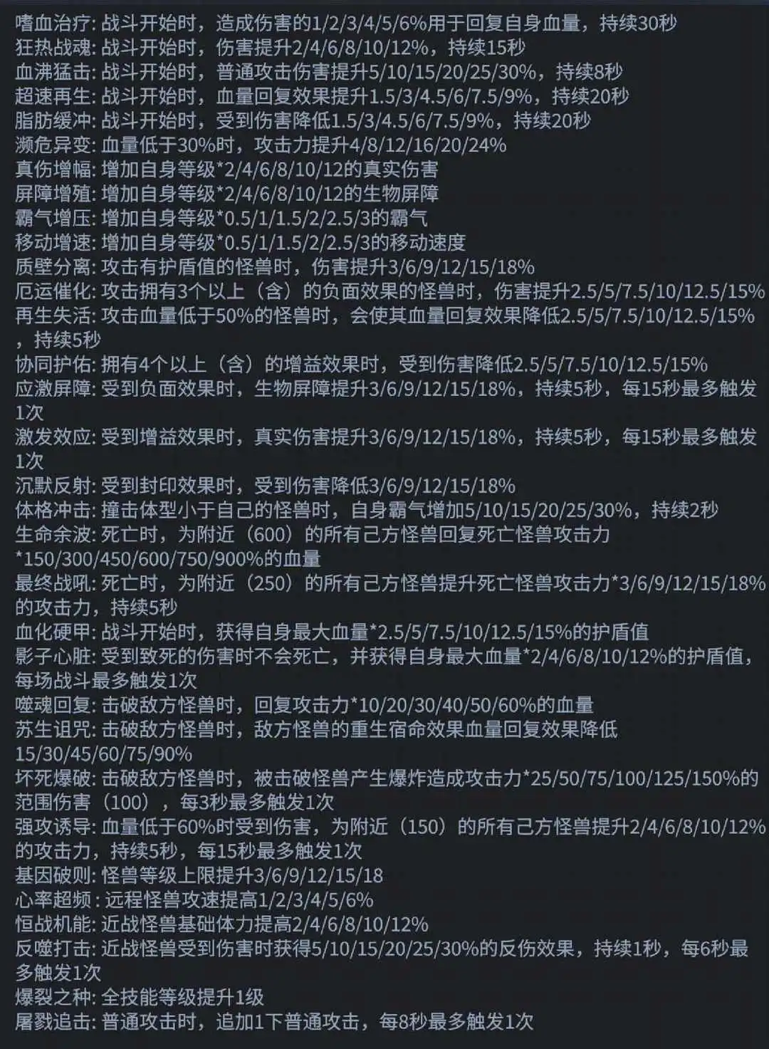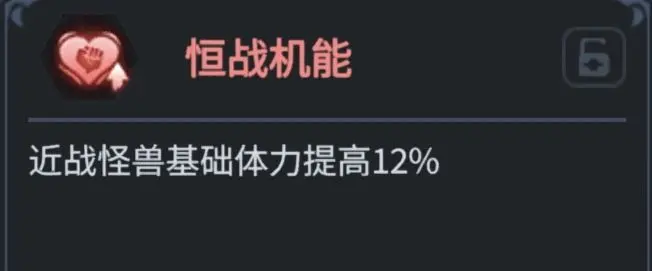 这个技能比较看品质,只有橙色和红色才比较好一些。恒战技能几乎适用于所有近战类型的怪兽,有效提升体力,还是很不错的。(要注意这个技能只适用近战怪兽,远程怪兽没有任何效果)