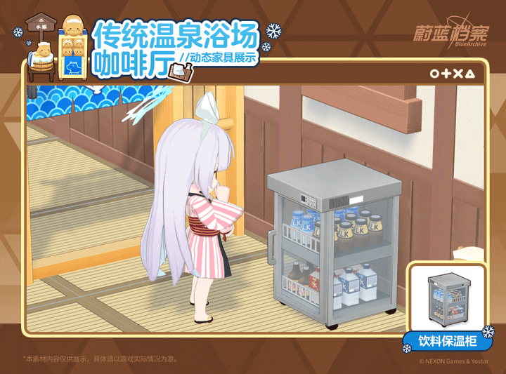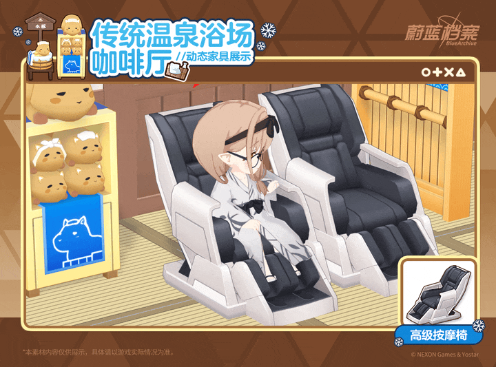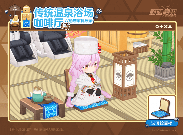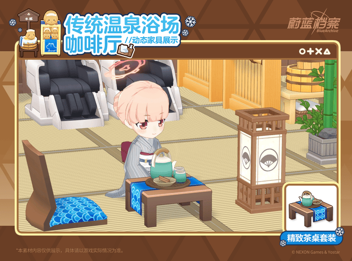 【传统温泉浴场】家具套装中包含4件全新“可互动的家具”,在咖啡厅配置“可互动的家具”后,当特定成员来访时,就会与家具产生交互动作!