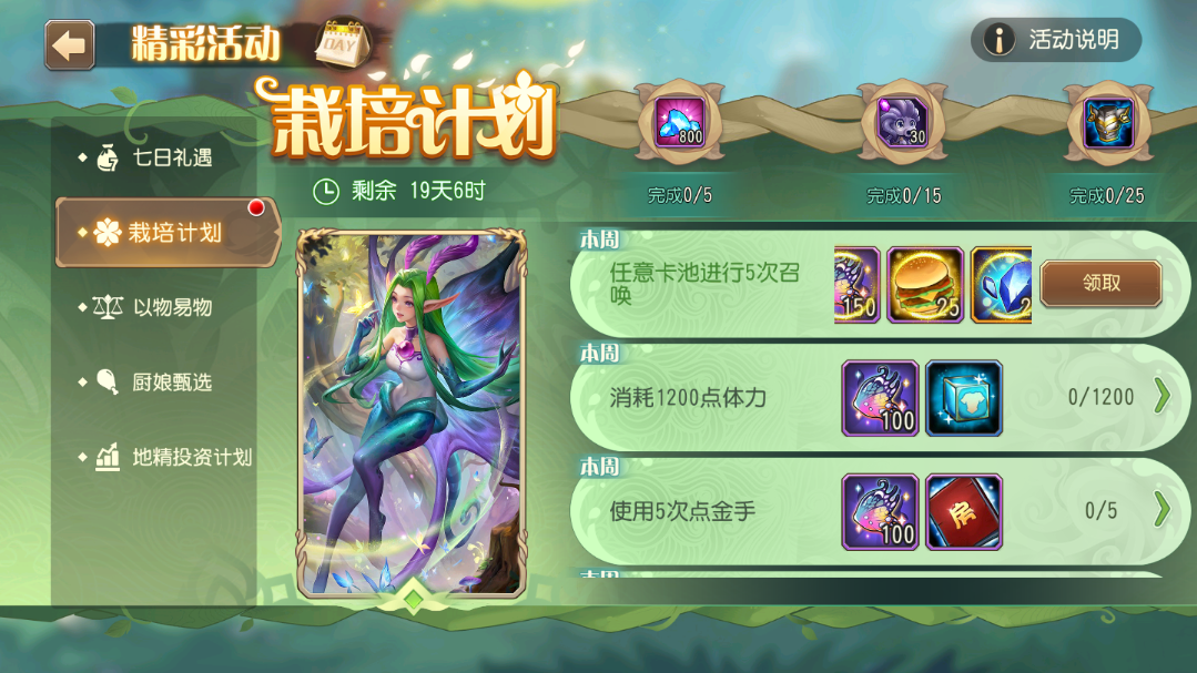 (2)栽培任务中包含有一次性任务和本周任务,一次性任务在活动期间仅能完成一次,本周任务将在每周一5点刷新。