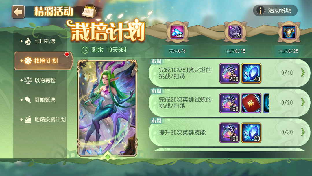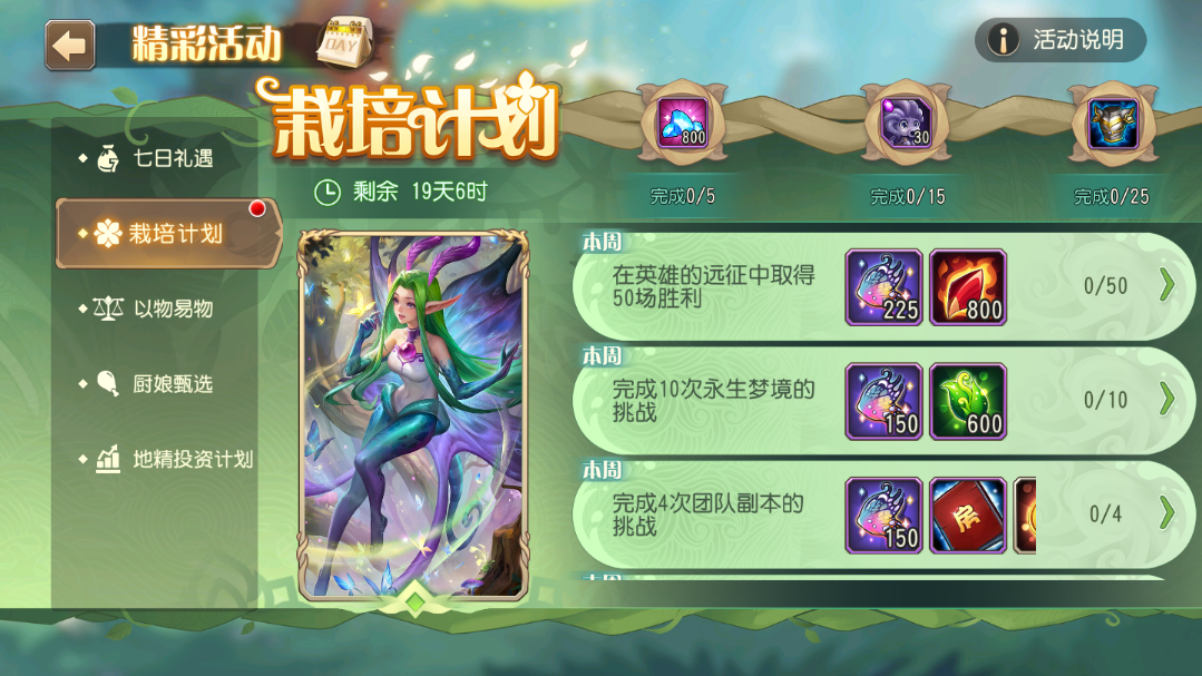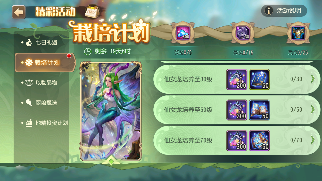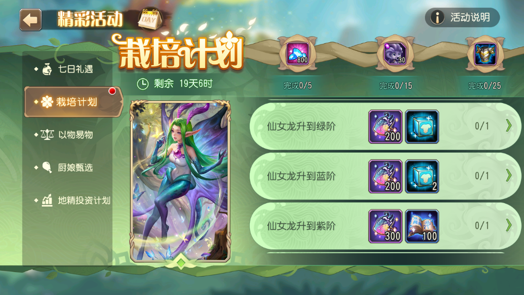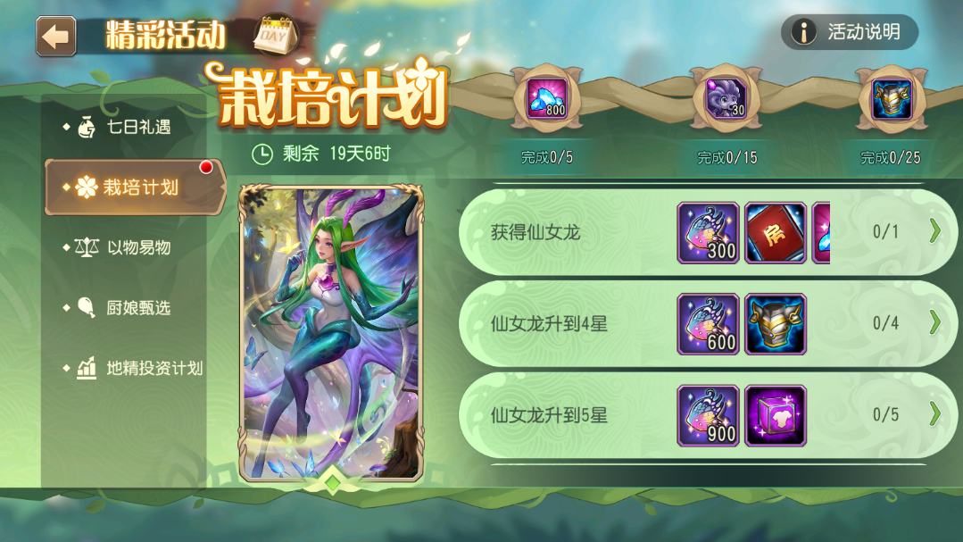(1)活动期间,完成仙女龙养成等栽培任务,可获得活动道具“闪耀蝶翼”及钻石,灵魂石(小鱼人),英雄装备,技能升级材料等丰厚奖励。