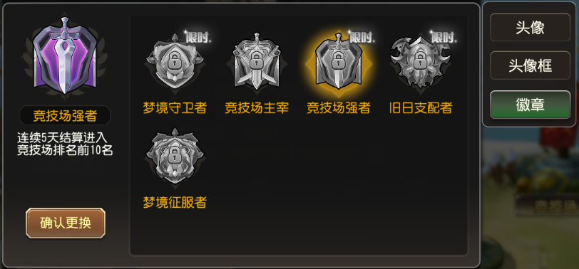 (1)竞技场主宰(永久):连续7天结算进入竞技场排名前5名
