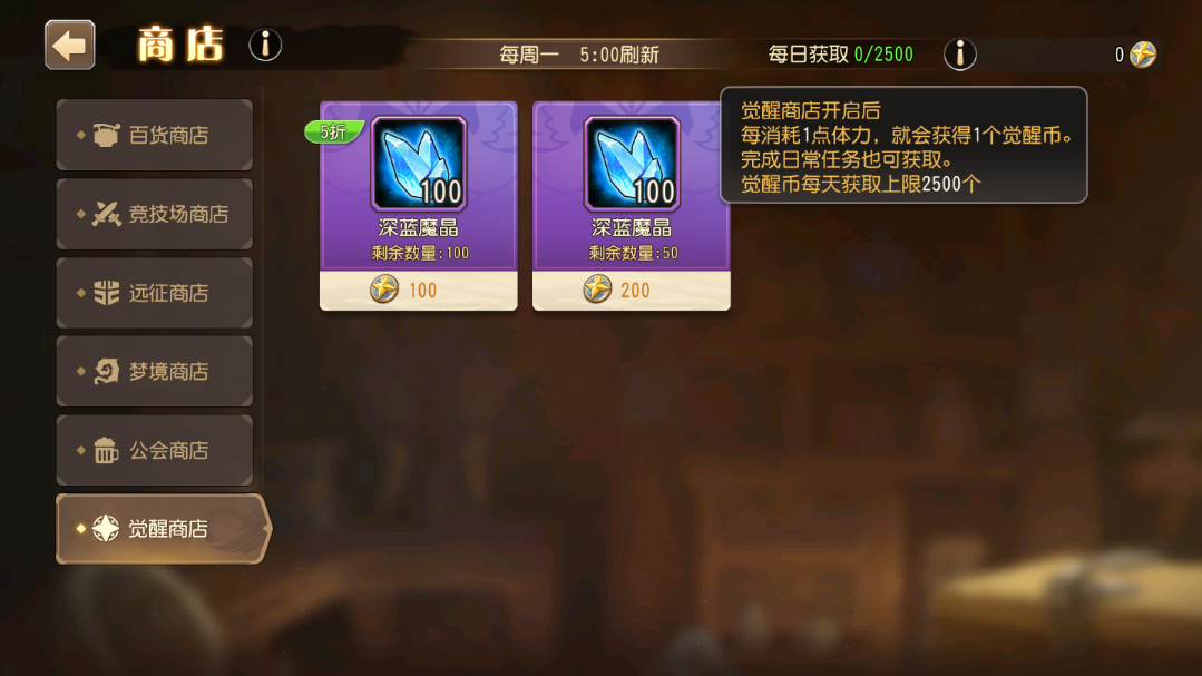 (3)开启觉醒商店后,觉醒币通过消耗体力与每日任务宝箱获取,每日有获取上限,最多持有10万枚。