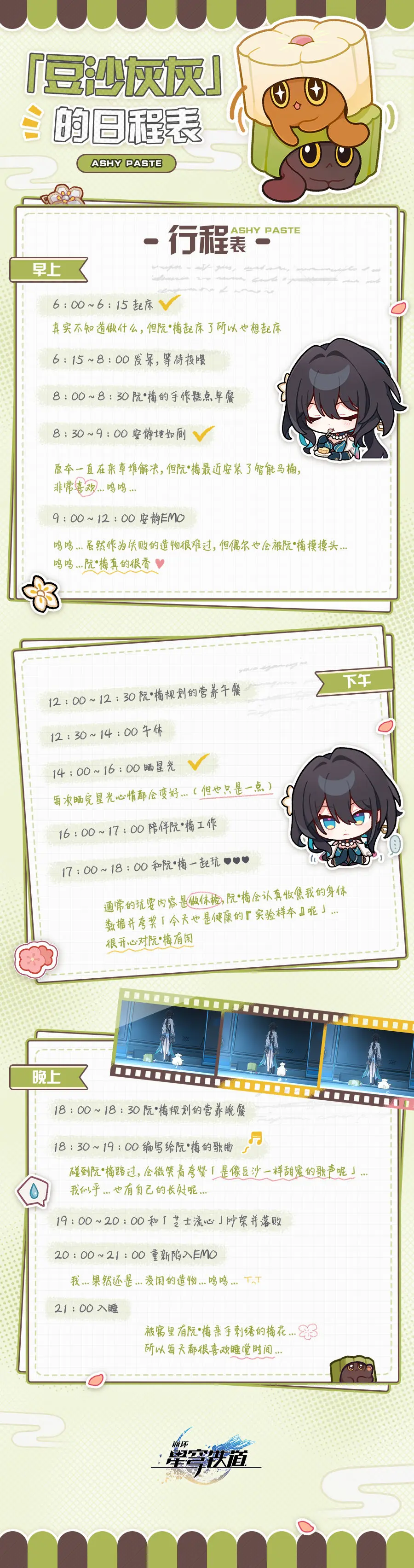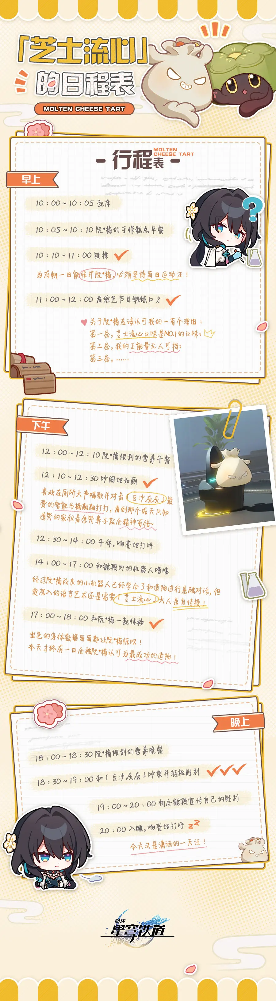 「芝士流心」和「豆沙灰灰」的日程表崩坏:星穹铁道 - 新闻星发布于 2024-01-03关注 帕姆居然不小心看到了「阮•梅造物」的日程表……这应该不算什么实验室机密信息吧?没想到身为造物的生活也如此繁忙。不过,阮•梅女士看起来冷冰冰的,但其实对自己的造物也挺好的嘛!帕姆也好想吃阮•梅女士的手作糕点帕!
