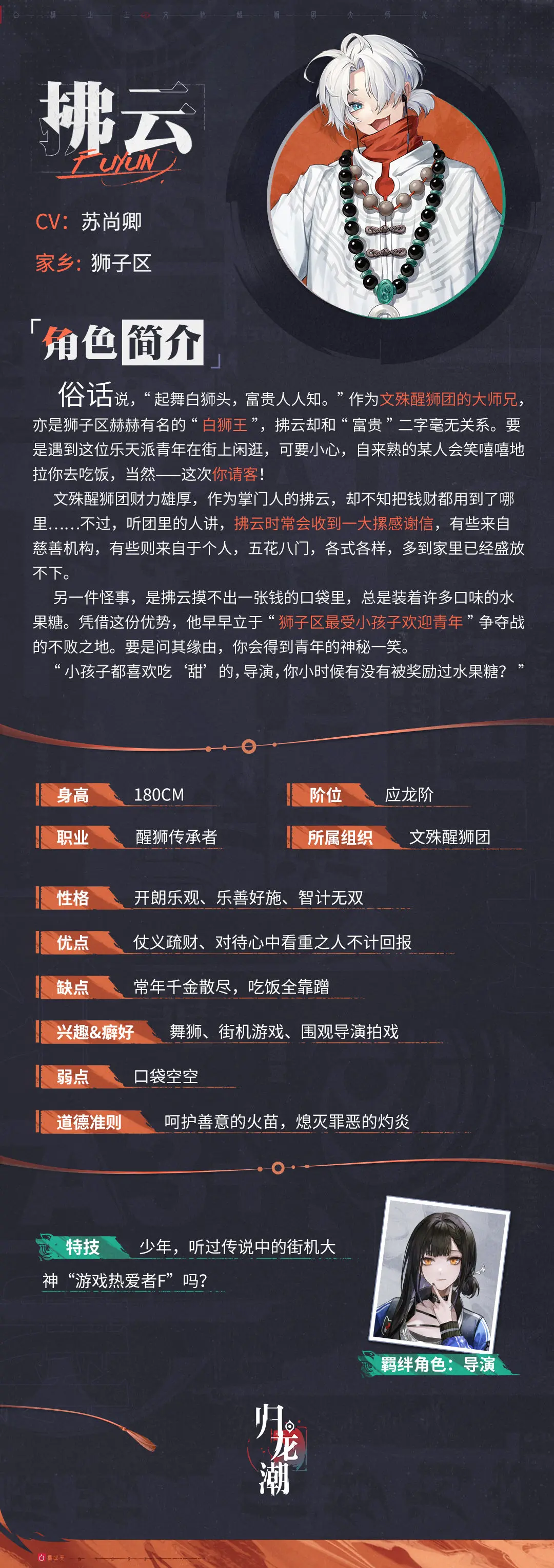 在繁华热闹的狮子区中,拂云的舞狮奇技与善举雅行,比他的街机水平更为人所津津乐道。抛开爱找人接济三餐和爱围观导演拍戏的嗜好——头顶文殊醒狮团掌门人光环的拂云,可谓是个宝藏男孩。