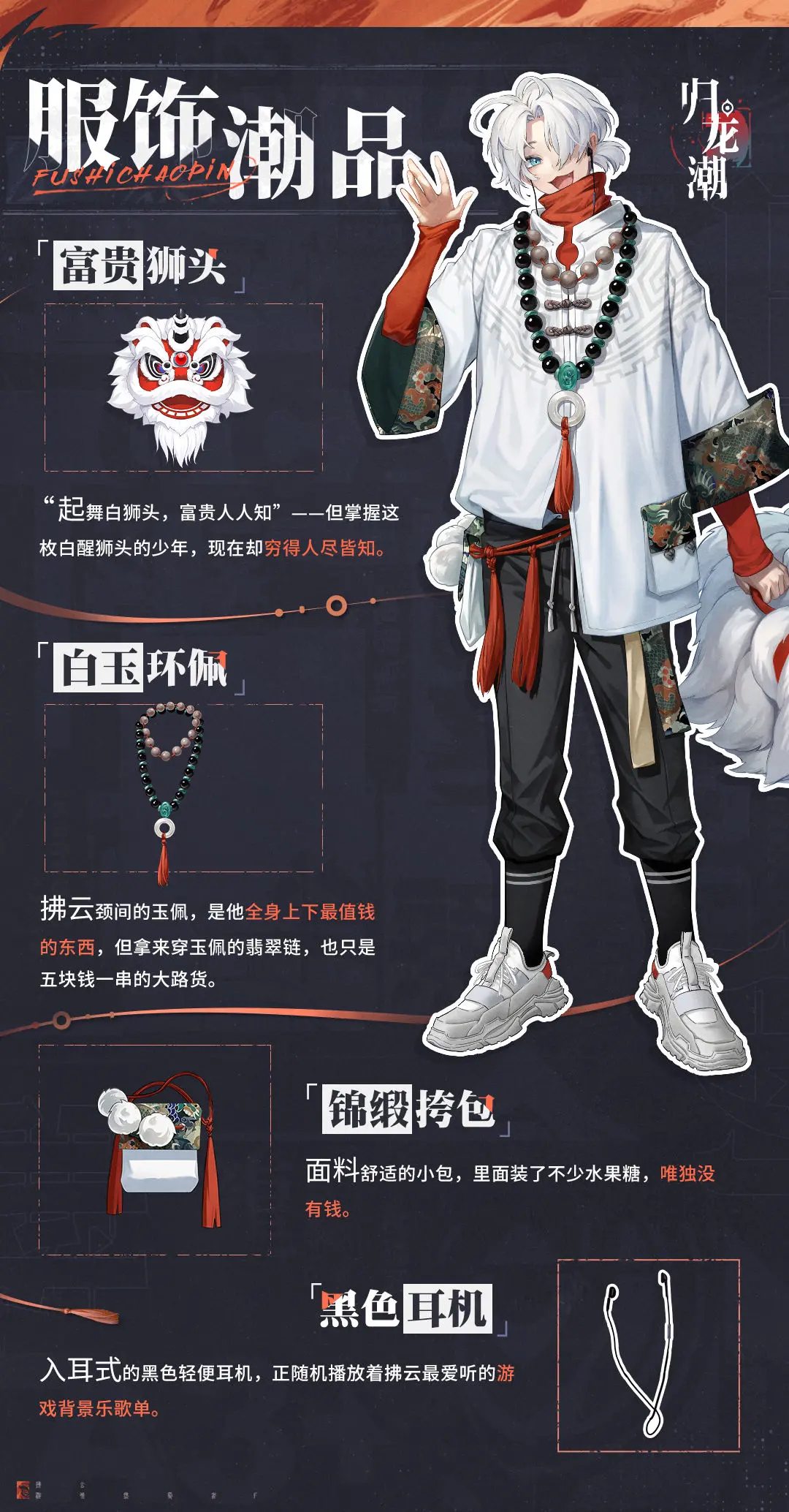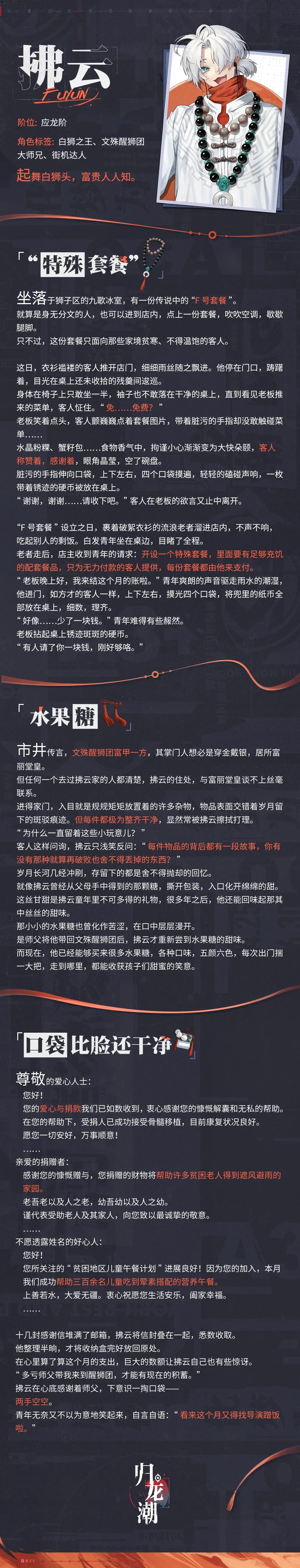 乐善好施,不求回报,见称于各大慈善机构的他,口袋里总是装着许多口味的水果糖。凭借这份优势,他早早立于“狮子区最受小孩子欢迎青年”争夺战的不败之地。要是问其缘由,你会得到青年的神秘一笑。