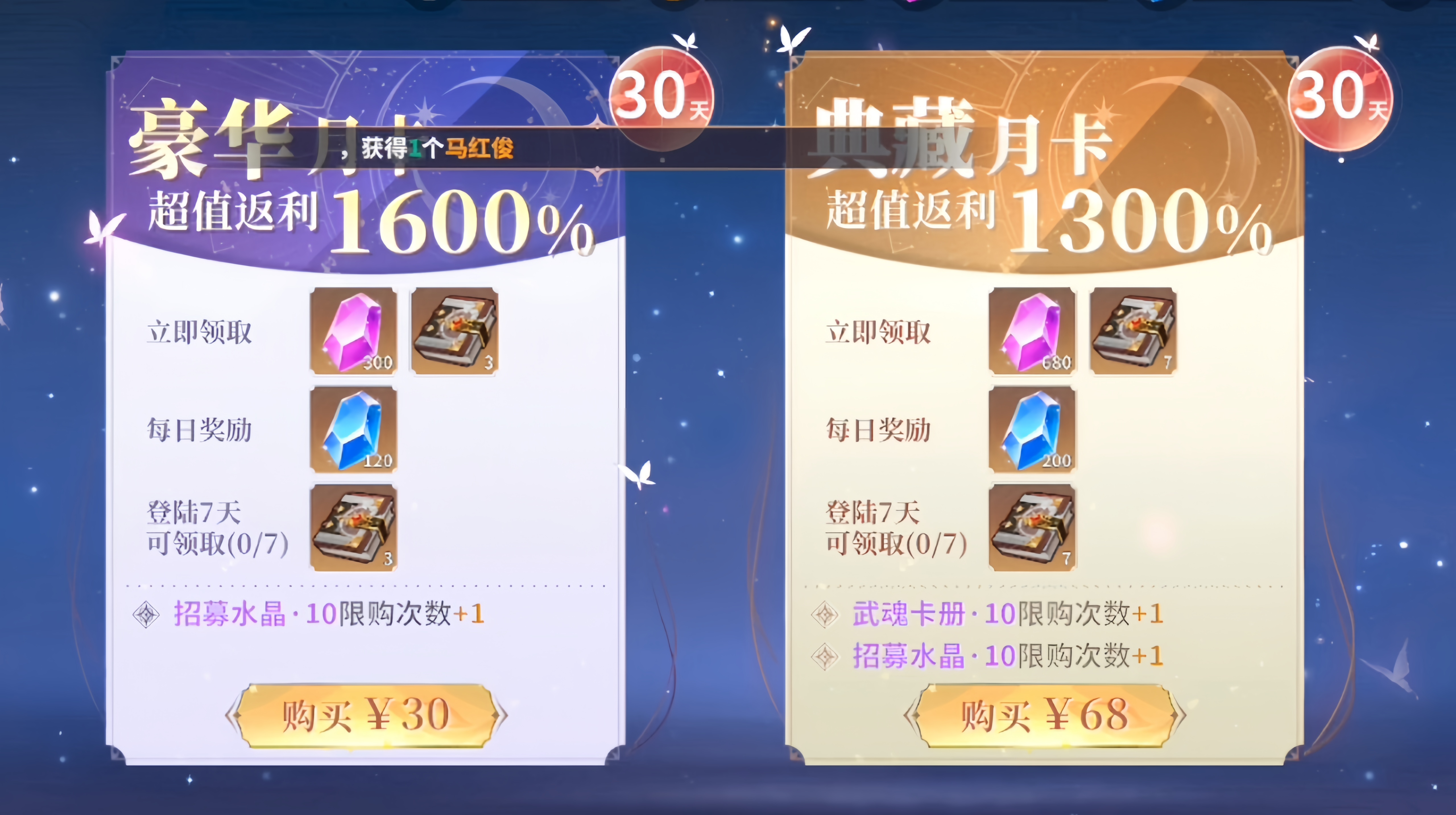 典藏月卡每日可以领取300魂灵,累计可以获得9000蓝晶。价格为68元。
