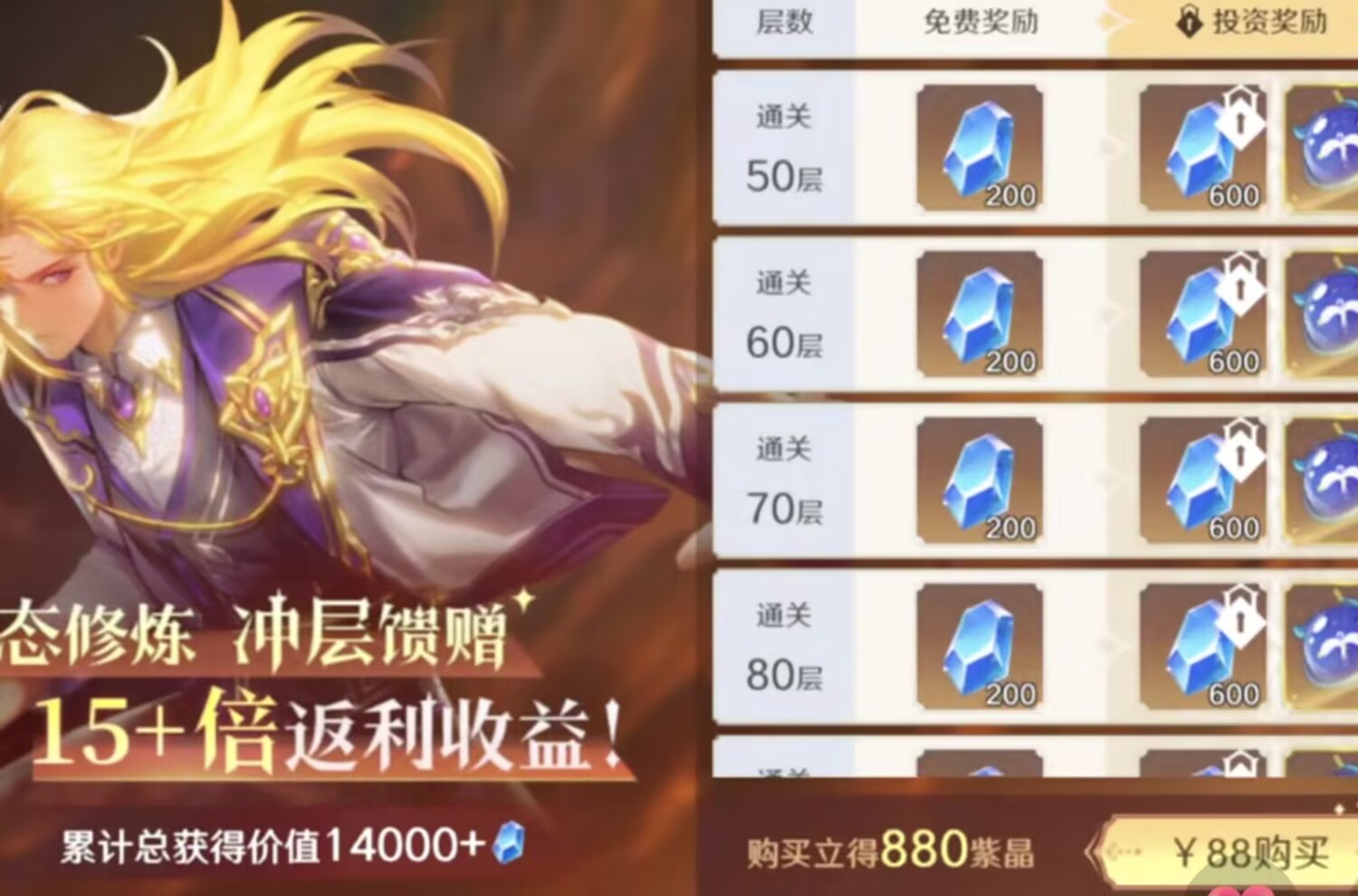 购买后可以立马获得880个紫晶,并且拟态修炼通关100层以后,累计可以获得1.4万的蓝晶,性价比非常高。大量的蓝晶可以帮助我们前期更好的去抽卡,游戏整体的体验和发育会更加平滑。
