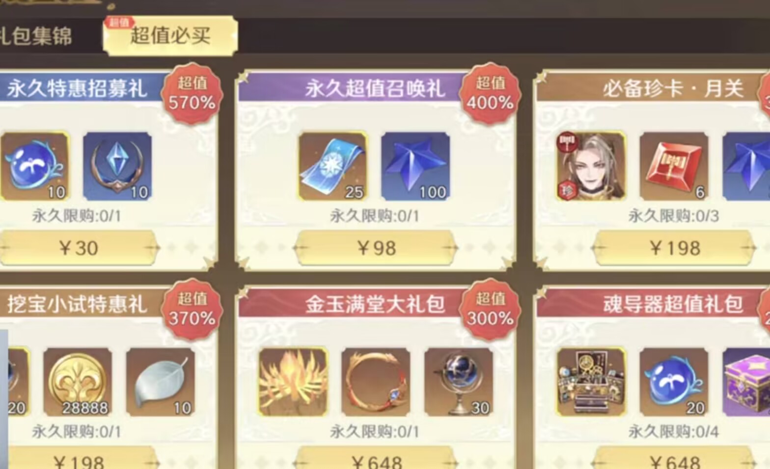 优先购买永久限购的30元档位、98元档位和2个198元档位的礼包。