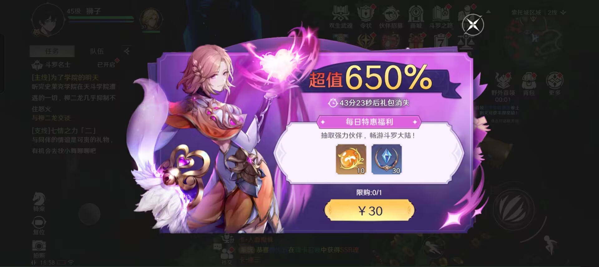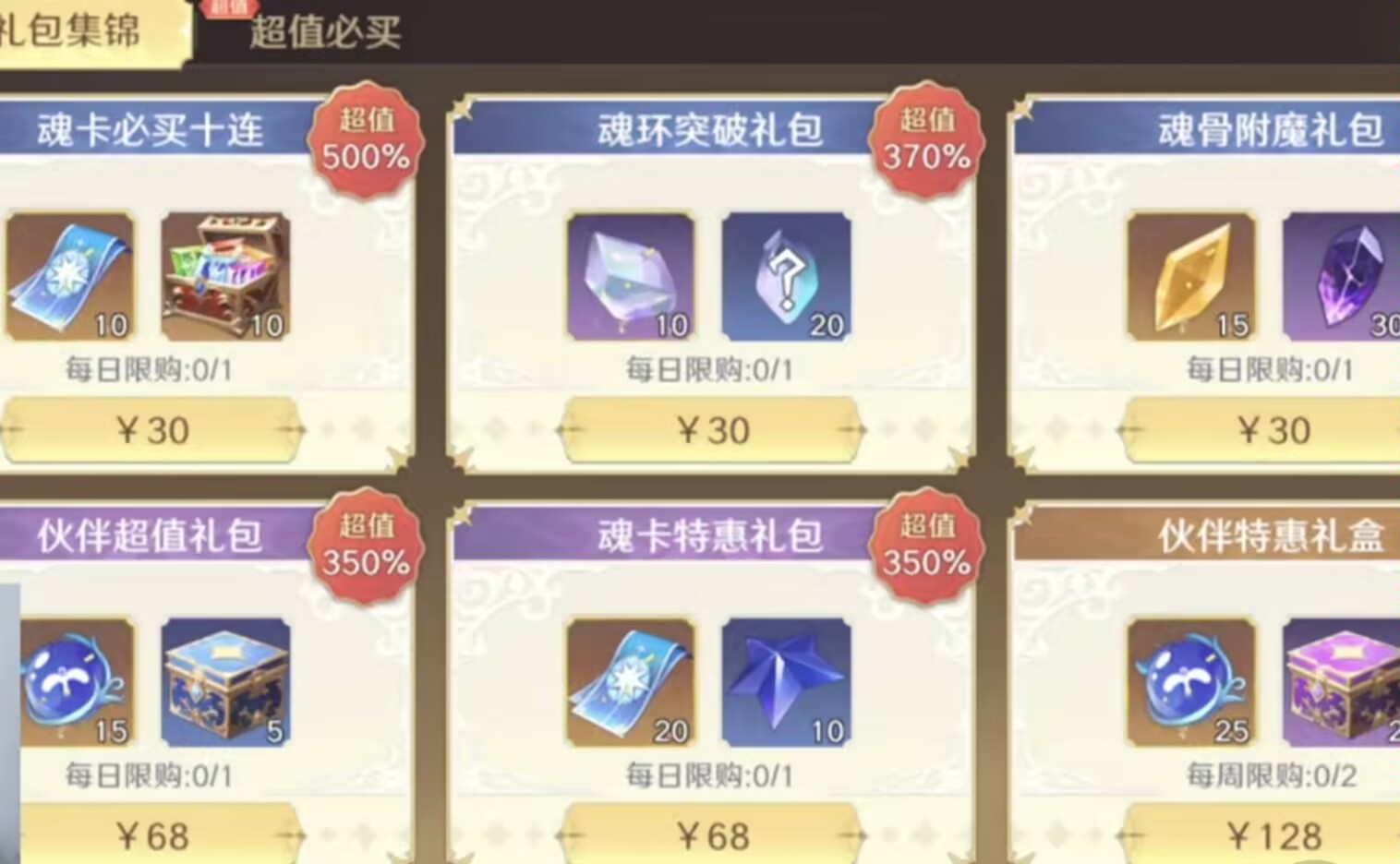 ⭐剩下的可以购买:魂卡每日限购礼包、魂环每日限购突破礼包、伙伴每日限购超值礼包。