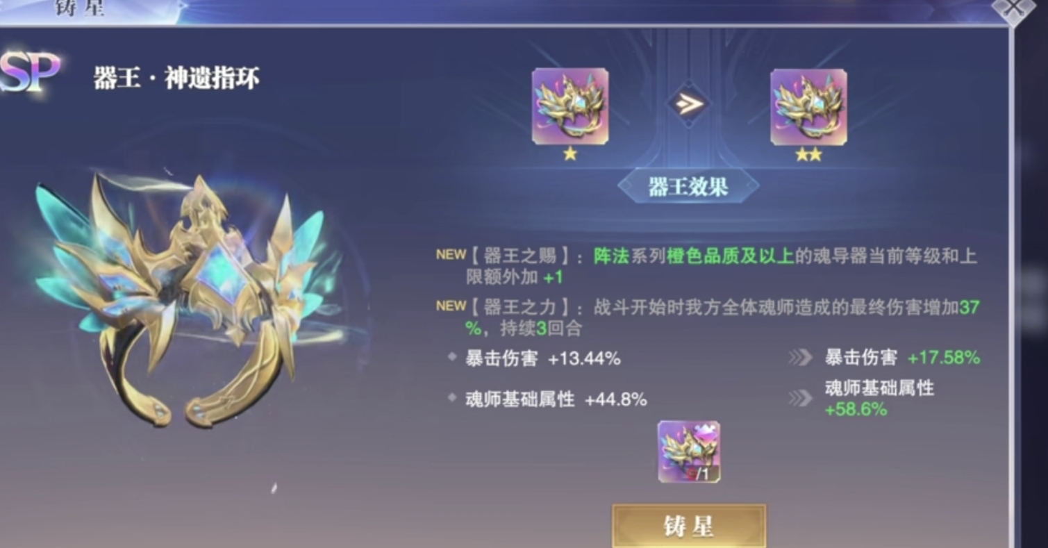⭐初级和满级的器王神遗指环有什么区别?满级效果和初级效果最大的区别是:满级增加了【器王之赐】和【器王之威】效果。