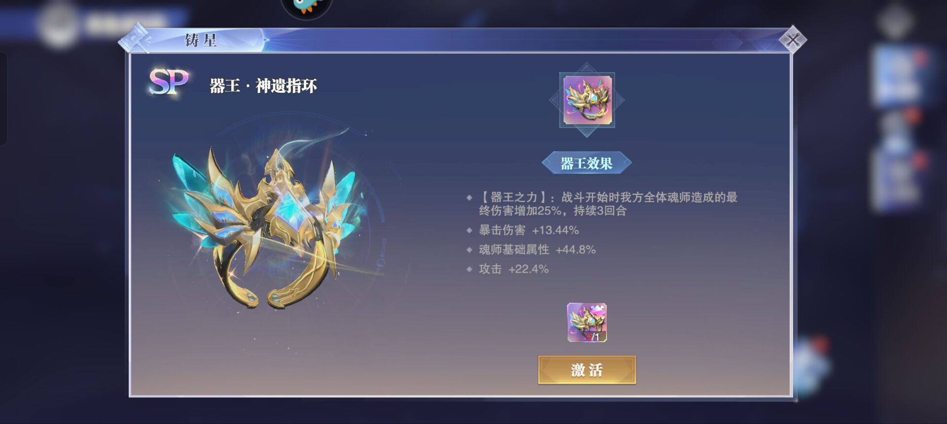 一:【sp器王—神遗指环】强度分析。首先【神遗指环】初级的铸星效果只拥有:器王之力。