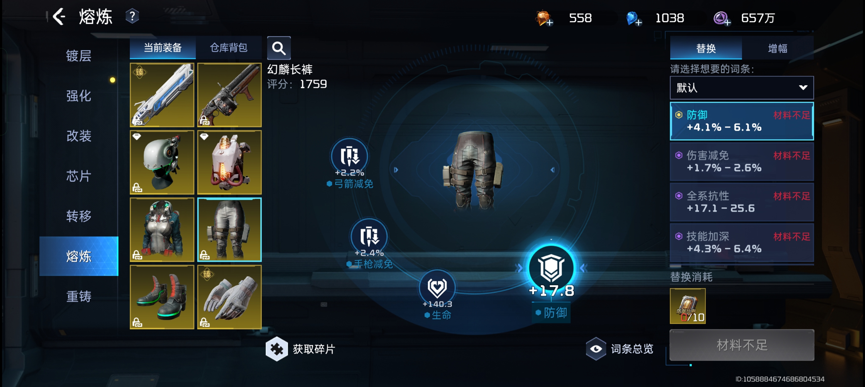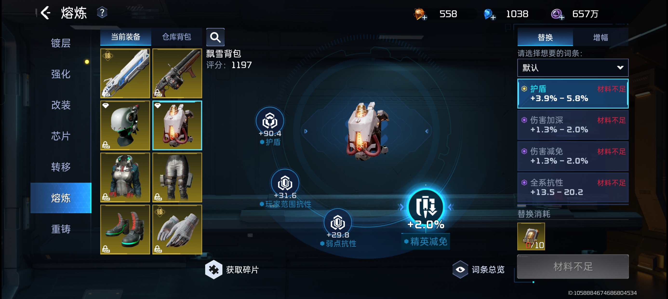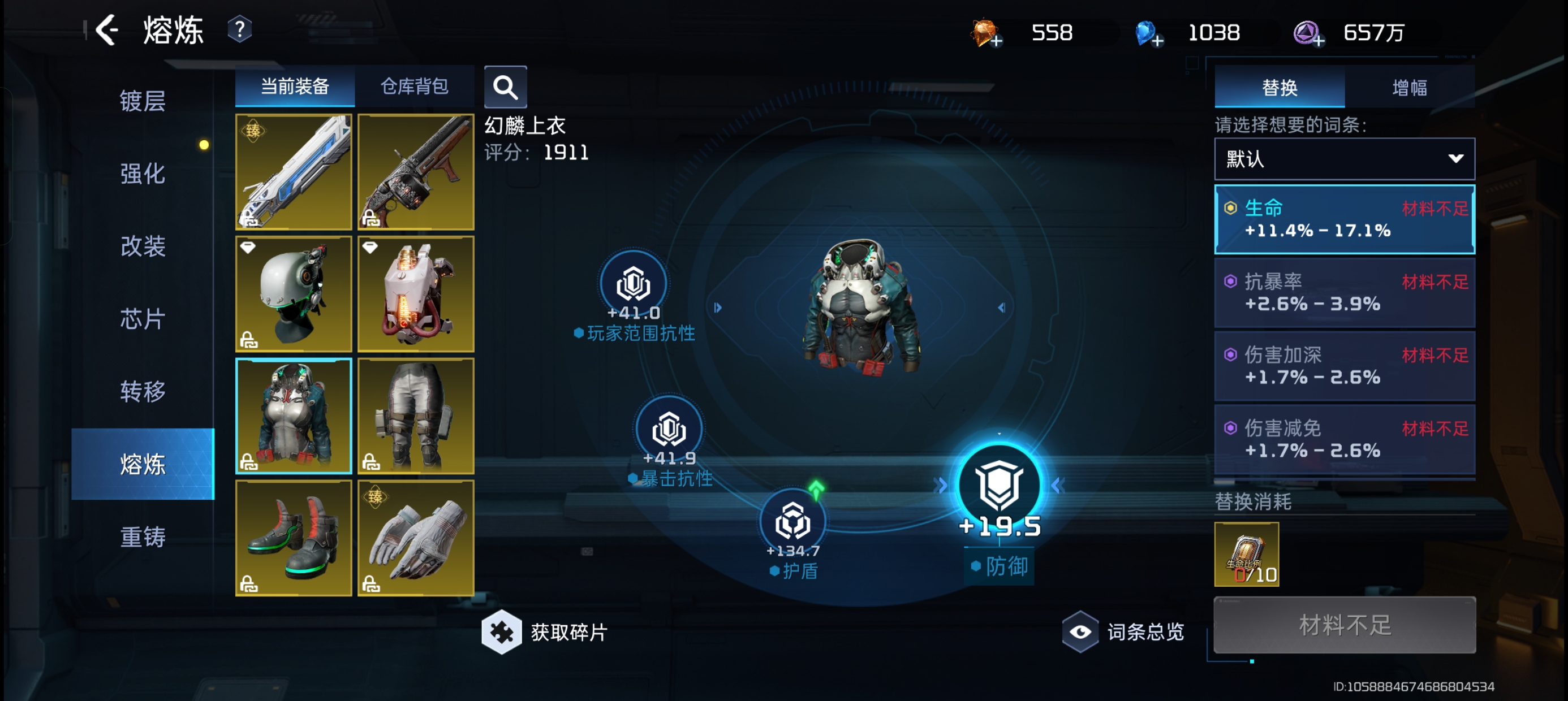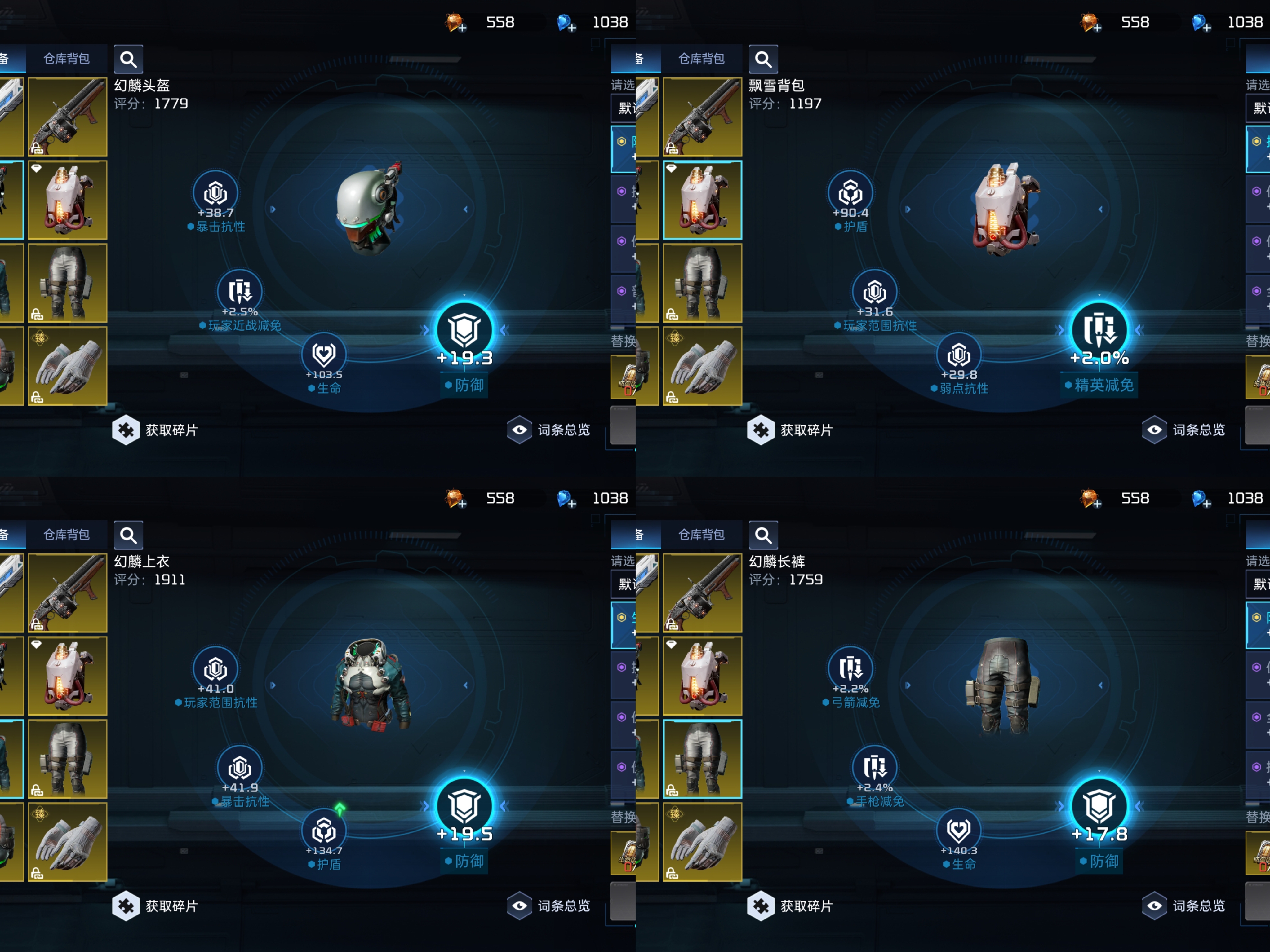 ②防具–头盔 背包 衣服 裤子–属性的选择。防具这四个部位属性,狮子推荐主推:护盾、防御、生命。这3个属性。