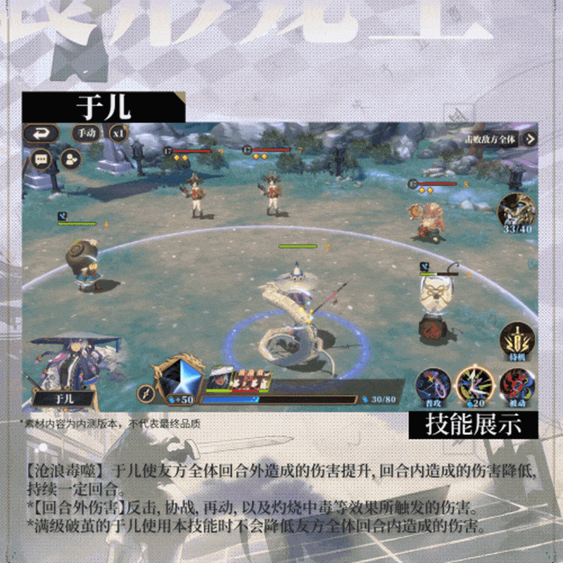 沧浪毒噬:于儿使友方全体回合外造成的伤害提升,回合内造成的伤害降低,持续一定回合。